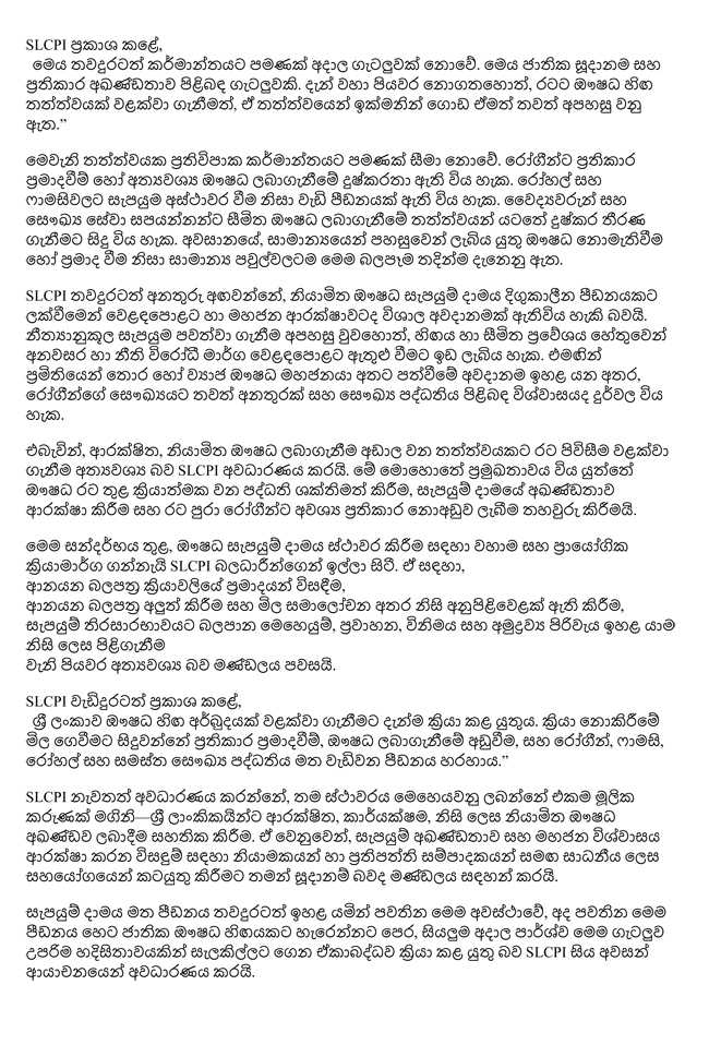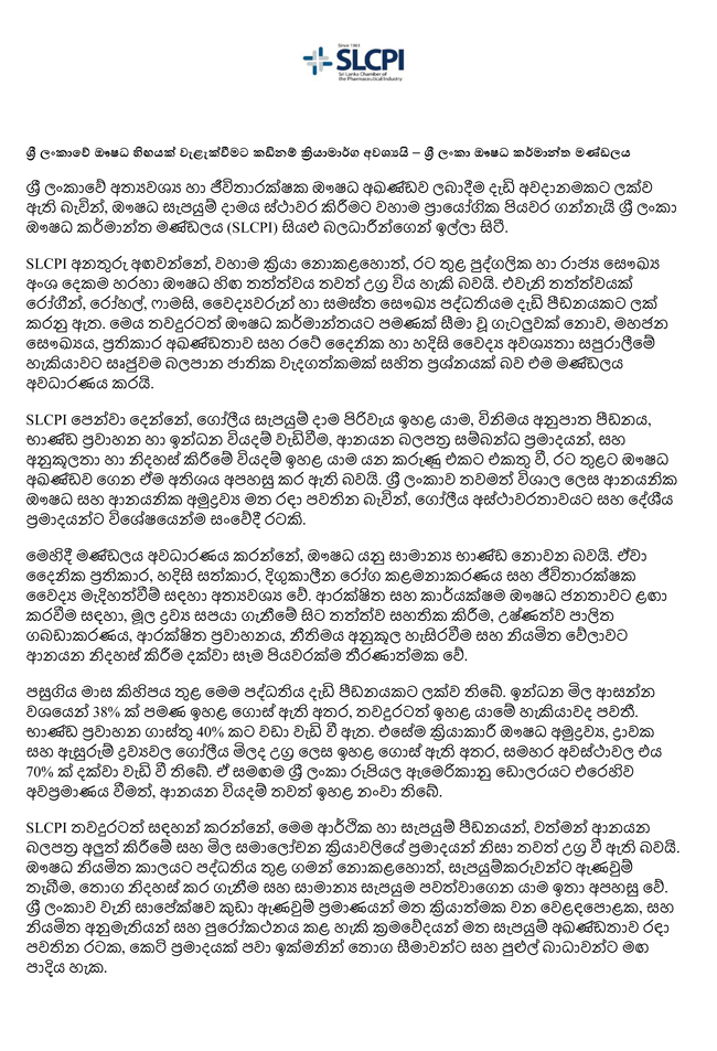 ශ්රී ලංකාවේ අත්යවශ්ය සහ ජීවිතාරක්ෂක ඖෂධ අඛණ්ඩව ලබාදීම දැඩි අවදානමට ලක්ව ඇති බැවින්, ඖෂධ සැපයුම්දාමය ස්ථාවර කිරීමට වහාම ප්රායෝගික පියවර ගන්නා ලෙස ශ්රී ලංකා ඖෂධ කර්මාන්ත මණ්ඩලය (SLCPI) සියලු බලධාරීන්ගෙන් ඉල්ලා සිටින බව එම නිවේදනයේ සඳහන් වේ.