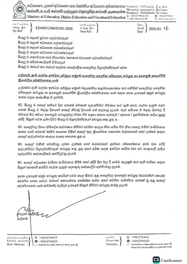 උද්ගතව ඇති ලෝක ඉන්ධන අර්බුදය හමුවේ පාසල්වල දෛනික පරිපාලනය හා ඉගෙනුම් ඉගැන්වීම් ක්රියාවලිය පවත්වාගෙන යාම සහතික කිරීම සඳහා අධ්යාපන අමාත්යාංශය අද (17) විශේෂ මාර්ගෝපදේශ මාලාවක් ප්රකාශයට පත් කර ඇත.
