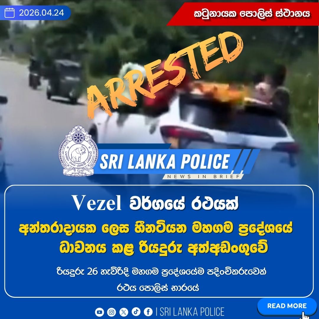 2026.04.18 වන දින හීනටියන මහගම ප්රදේශයේ පැවැත්වුනු අලුත් අවුරුදු උත්සවයක් අතරතුර අසල මාර්ගයක මහජනතාවටත්, දේපළවලටත් අන්තරාදායක වන අයුරින් ධාවනය වූ සුදු පැහැති Vezel වර්ගයේ කාර් රථය, කටුනායක පොලිස් ස්ථානය විසින් එම අවස්ථාවේ රථය පැදවූ රියදුරු සමඟ පසුගිය 22 වන දින අත්අඩංගුවට ගෙන ඇත.