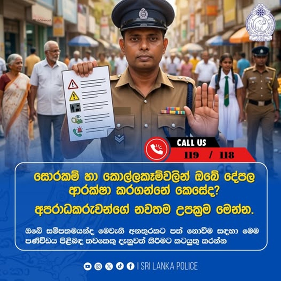 ශ්රී ලංකා පොලිසිය පෙන්වා දෙනු ලබන ඉහත උපදෙස් හා මඟ පෙන්වීම් සම්බන්ධව නිසි අවබෝධයකින් යුතුව බුද්ධිමත්ව කටයුතු කිරීම ඉතා අත්යවශ්ය කටයුත්තක් බව ශ්රී ලංකා පොලිසිය පෙන්වා දෙනු ලබන අතර මෙවැනි අපරාධ වළක්වා ගැනීම සඳහා මහජනයා සතු අවබෝධය වඩාත් තහවුරු කර ගැනීමටත් ඔබ සමීපතමයන්ද මෙවැනි අනතුරකට පත් නොවීම සඳහා මෙම පණිවිඩය පිළිබඳ තවකෙකු දැනුවත් කිරීමට කටයුතු කරන ලෙසත් ශ්රී ලංකා පොලිසිය මහජනතාවගෙන් ඉල්ලා සිටිනු ලැබේ.