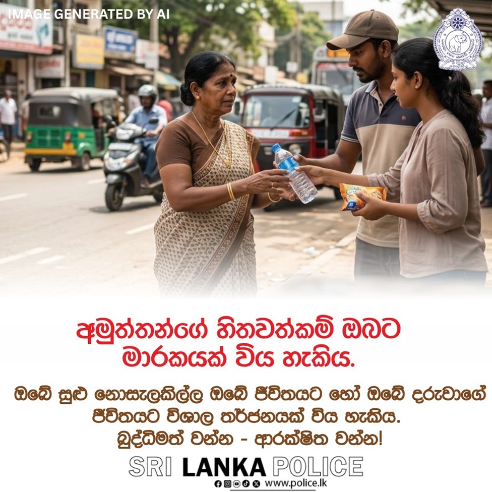 - පාරේදී හමුවන පුද්ගලයන් ලබා දෙන වතුර බෝතල්, සිසිල් පැන්, ටොෆි හෝ වෙනත් කිසිදු ආහාරයක් කිසිවිටෙකත් භාර නොගන්න. ඉතා සුළු මොහොතකින් ඔබව සිහිසුන් කළ හැකි මත්ද්රව්ය මෙවැනි දෑට මිශ්ර කිරීමට අපරාධකරුවන් දක්ෂය.