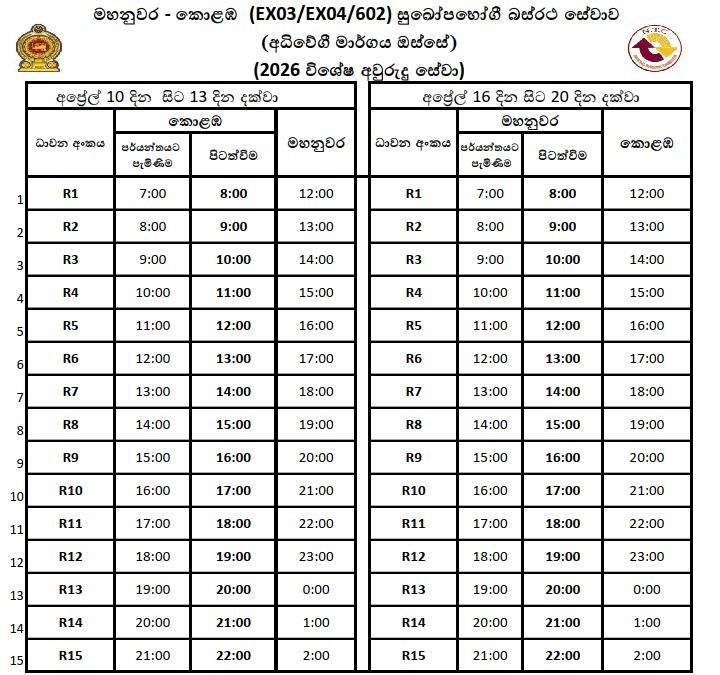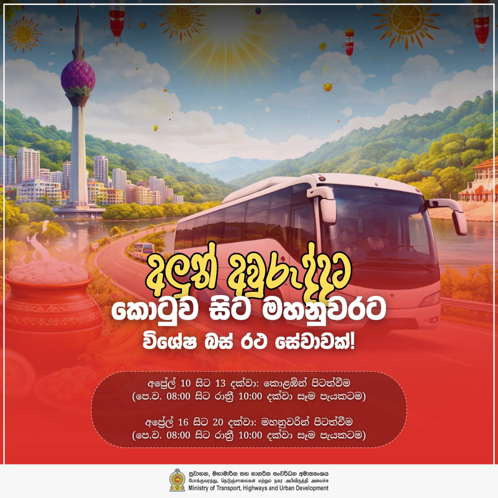 දිට්වා සුළි කුණාටුවේ බලපෑම මත දුම්රිය ගමනා ගමනය අඩාල වීම මත අවුරුදු සේවාව වෙනුවෙන් කොළඹ සිට මහනුවර දක්වා යොදවන විශේෂ බස් රථ සේවාව හෙට (10) දින සිට පහත කාලසටහන අනුව ධාවනය වන බව ප්රවාහන අමාත්යාංශය නිකුත් කළ නිවේදනයක සඳහන් වේ.