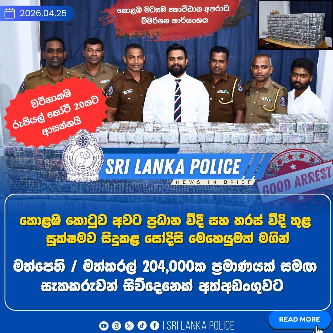 කොළඹ මධ්යම කොට්ඨාස අපරාධ විමර්ශන කාර්යංශයේ උප පොලිස් පරීක්ෂක කලිඳු නිලධාරියා සමඟ නිලධාරීන් කණ්ඩායමක් ඊයේ (24) දින දහවල් කොළඹ කොටුව ඇතුළත වීදි සෝදිසියට ලක්කිරීමෙන් මත්පෙති කරල් 204,000ක ප්රමාණයක් සමඟ සැකකරුවන් සිව්දෙනෙක් අත්අඩංගුවට ගැනීමට හැකිවී තිබේ.