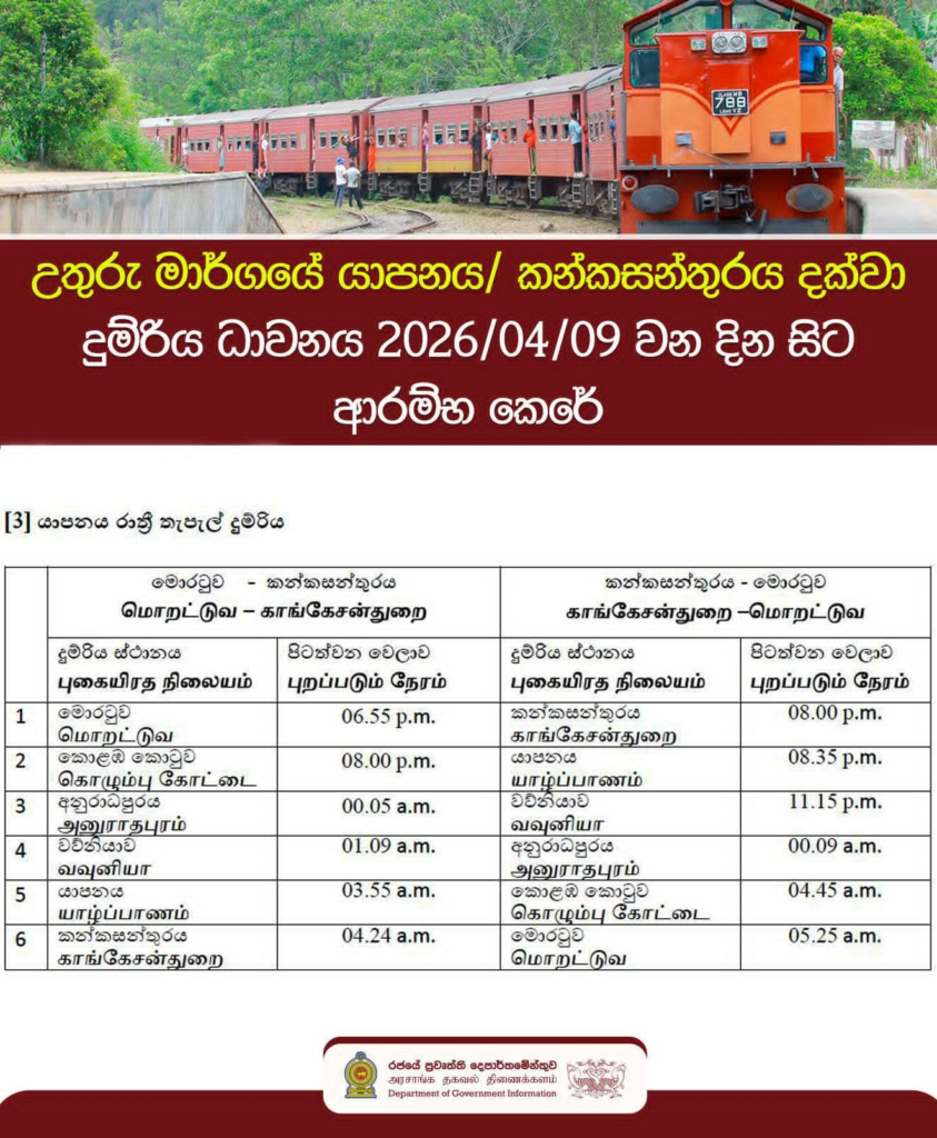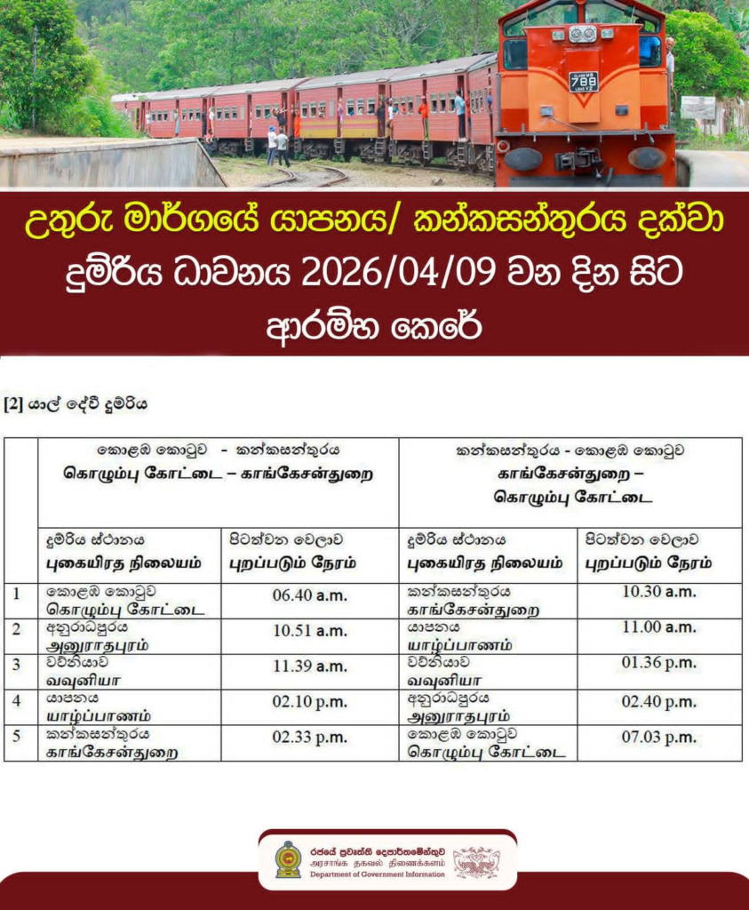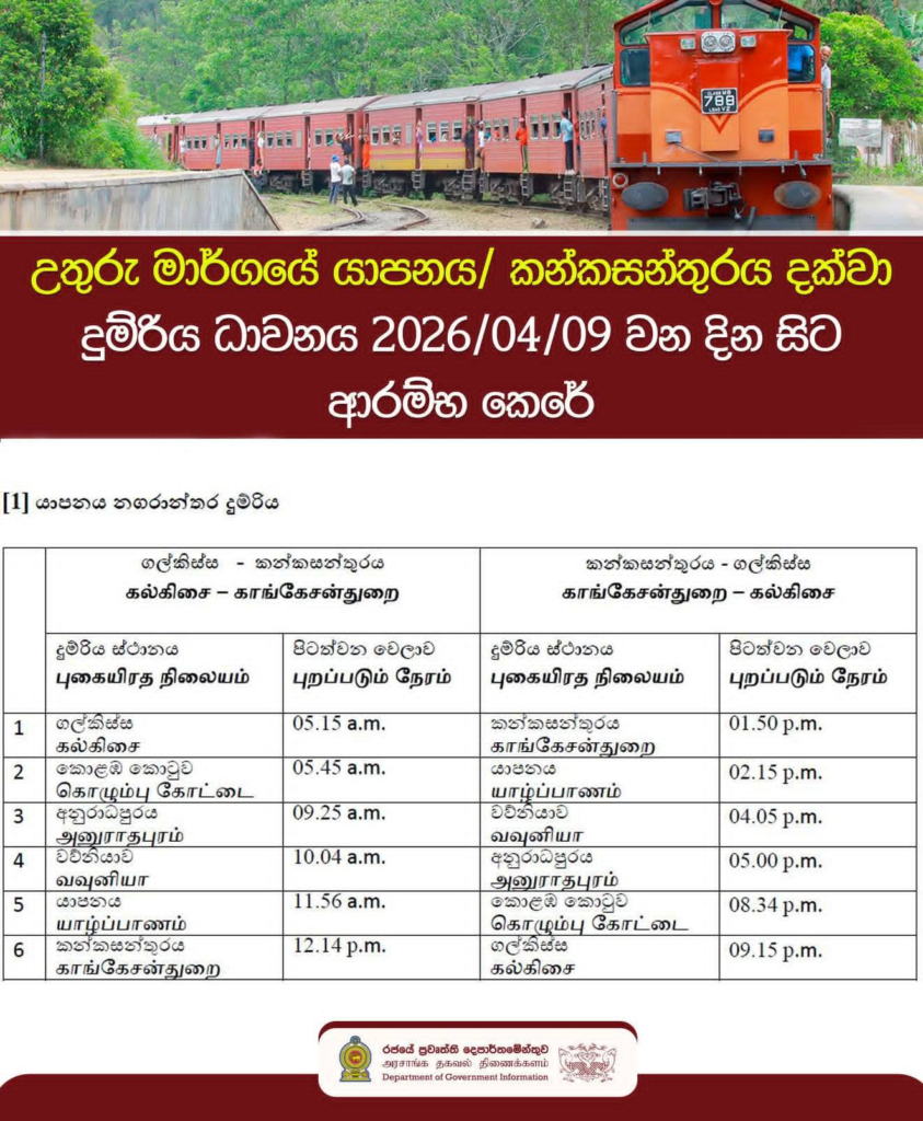 දිට්වා සුළි කුණාටුවෙන් හානියට පත් වීම හේතුවෙන් තාවකාලිකව ධාවන කටයුතු නතර කර තිබූ කොළඹ කොටුව සහ කන්කසන්තුරෙයි (KKS) අතර උතුරු දුම්රිය මාර්ගයේ දුම්රිය සේවා අද (09) සිට නැවත ආරම්භ කරන බව දුම්රිය දෙපාර්තමේන්තුව නිවේදනය කර ඇත.