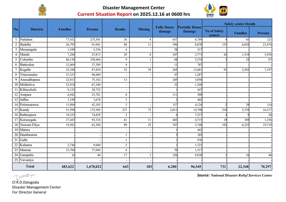 ආපදා කළමනාකරණ මධ්යස්ථානය විසින් අද (16) දින පෙ.ව 06.00ට නිකුත් කළ තත්ත්ව වාර්තාව අනුව දිට්වා සුළි කුණාටුවෙන් මිය ගිය පුද්ගලයින් 643ක් වන අතර අතුරුදන් වූ පුද්ගලයින් 183කි. මේ වන විට පවුල් 483,622කට අයත් පුද්ගලයින් 16,78,022ක් විපතට පත්ව ඇති අතර මේ වන විට ආරක්ෂිත නිවාස 731ක පවුල් 22,348කට අයත් පුද්ගලයින් 70,297 දෙනකු රැදී සිටිති.