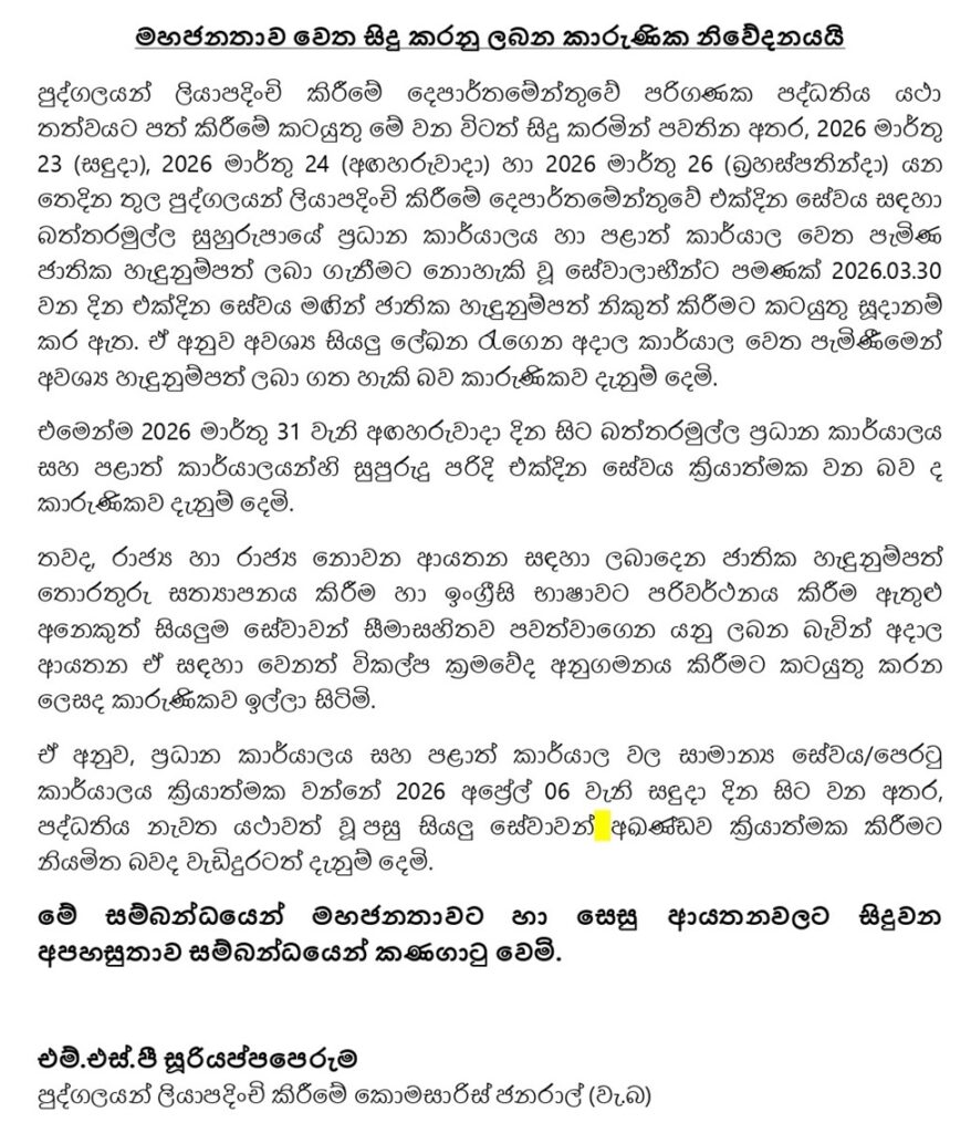 පුද්ගලයින් ලියාපදිංචි කිරීමේ දෙපාර්තමේන්තුවේ එක්දින සේවාව සඳහා සාමාන්ය මෙහෙයුම් හෙට (31) බත්තරමුල්ල ප්රධාන කාර්යාලයේ සහ සියලුම පළාත් ශාඛාවල නැවත ආරම්භ වන බව පුද්ගලයින් ලියාපදිංචි කිරීමේ වැඩබලන කොමසාරිස් ජනරාල් එම්.එස්.පී. සූරියප්පෙරුම මහතා පවසයි.