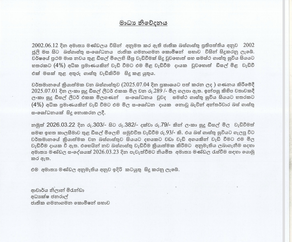 ඉන්ධන මිල ඉහළ යාමෙන් පසු බස් රථ හිමියන් මුහුණ දෙන මෙහෙයුම් පිරිවැය ඉහළ යාම මධ්යයේ මෙම පියවර ගෙන ඇති අතර, පොදු ප්රවාහන සේවාවන්හි තිරසාරභාවය සහතික කිරීම සඳහා ගැලපීම් බලධාරීන් සලකා බලමින් සිටින බව ද එම නිවේදනයේ සදහන් වේ.