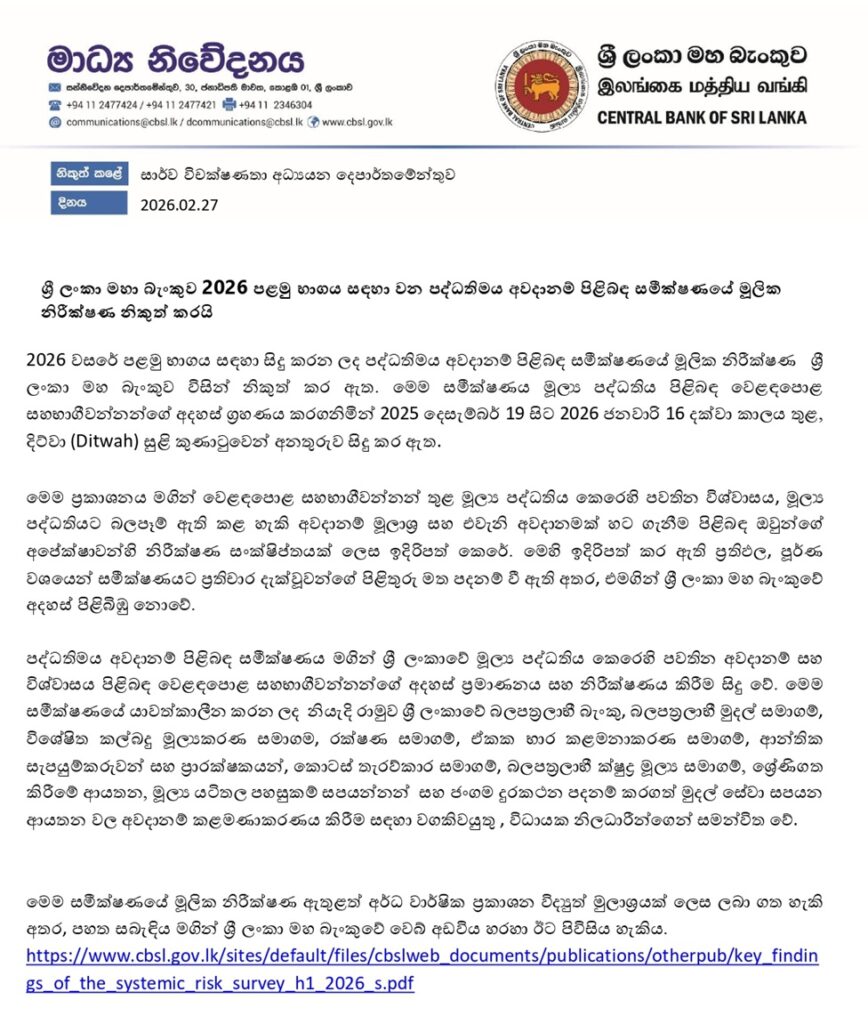 2026 වසරේ පළමු භාගය සඳහා සිදු කරන ලද පද්ධතිමය අවදානම් පිළිබඳ සමීක්ෂණයේ මූලික නිරීක්ෂණ ශ්රී ලංකා මහ බැංකුව විසින් නිකුත් කර ඇත. මෙම සමීක්ෂණය මූල්ය පද්ධතිය පිළිබඳ වෙළඳපොළ සහභාගීවන්නන්ගේ අදහස් ග්රහණය කරගනිමින් 2025 දෙසැම්බර් 19 සිට 2026 ජනවාරි 16 දක්වා කාලය තුළ, දිට්වා (Ditwah) සුළි කුණාටුවෙන් අනතුරුව සිදු කර ඇත.