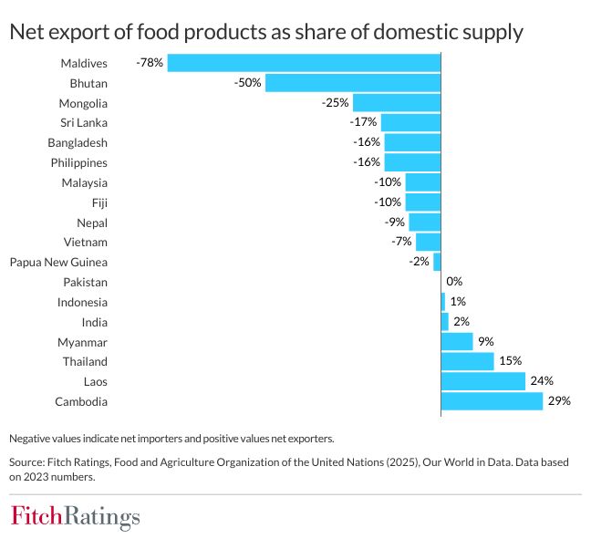 ආසියාවේ කෘෂි අංශ සඳහා පොහොර ලබා ගැනීමේ හැකියාව අඩු වීම සහ ඉහළ මිල ගණන් කෘෂි නිෂ්පාදන පිරිවැය ඉහළ දමයි. මෙම ඍණාත්මක තත්ත්වය යෙදුම් අනුපාත අධෛර්යමත් කිරීම සහ බෝග අස්වැන්න දුර්වල කිරීම හේතුවෙන් 2026 අග භාගයේදී ආහාර මිල ගණන් ඉහළ යනු ඇති බවත් ෆිච් වැඩි දුරටත් පෙන්වා දෙයි.