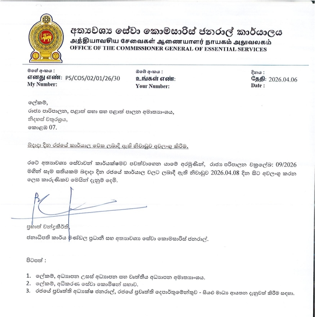 ජනාධිපති කාර්ය මණ්ඩල ප්රධානී සහ අත්යවශ්ය සේවා කොමසාරිස් ජනරාල් ප්රභාත් චන්ද්ර කීර්ති විසින් නිකුත් කරන ලද නියෝගයේ සඳහන් වූයේ, රාජ්ය පරිපාලන චක්රලේඛ අංක 09/2026 යටතේ හඳුන්වා දී ඇති සතියේ මැද නිවාඩුවක් ලබා දීමේ විධිවිධානය අප්රේල් 8 වන දින සිට තවදුරටත් ක්රියාත්මක නොවන බවයි.