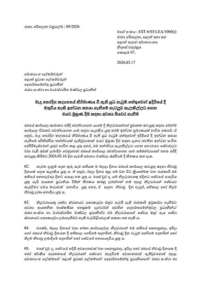 මැදපෙරදිග පවතින ගැටුම් මධ්යයේ ශ්රී ලංකාවේ ඉන්ධන සැපයුම් අභියෝගවලට මුහුණ දීම සඳහා ගත හැකි පියවර ගෙන හැර දක්වමින් රාජ්ය පරිපාලන, පළාත් සභා සහ පළාත් පාලන අමාත්යාංශ ලේකම්. එස්. ආලෝකබණ්ඩාර මහතාගේ අත්සනින් අද (17) චක්රලේඛයක් (09/2026) නිකුත් කර ඇත.