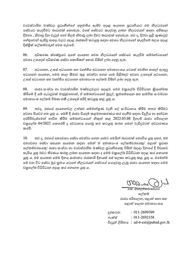 සෑම බදාදා දිනකම රාජ්ය සේවකයින්ට ලබා දෙන නිවාඩු නිසා, ඔවුන්ගේ නිල රාජකාරි එම සතියේ අඟහරුවාදා දිනවලට සැලසුම් කළ යුතු බව අදාළ චක්රලේඛයේ සඳහන් වේ.