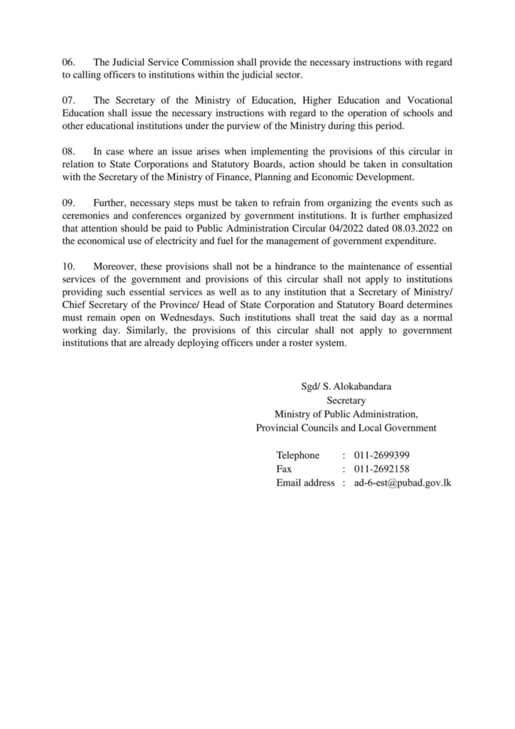 කෙසේ වෙතත්, යම් නිලධාරියෙකු බදාදා දිනයක සේවය කළ යුතු බව ආයතන ප්රධානියා තීරණය කරන්නේ නම්, එම නිලධාරීන් රාජකාරි සඳහා කැඳවීමට කිසිදු බාධාවක් නොතිබිය යුතු බව ද එවැනි වැඩ සඳහා නිවාඩු වැටුප්, අතිකාල හෝ වන්දි නිවාඩු ලබා නොදිය යුතු බව ද මෙම චක්රලේඛය අවධාරණය කර ඇත.