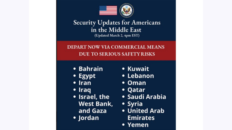 X හි පළ කරන ලද නිවේදනයක, රාජ්ය දෙපාර්තමේන්තුවේ කොන්සියුලර් කටයුතු පිළිබඳ සහකාර ලේකම් මෝරා නම්දාර් පැවසුවේ එක්සත් ජනපද පුරවැසියන් “බරපතල ආරක්ෂක අවදානම් හේතුවෙන්” ලැයිස්තුගත කර ඇති රටවලින් “වහාම ඉවත් විය යුතු” බවයි.