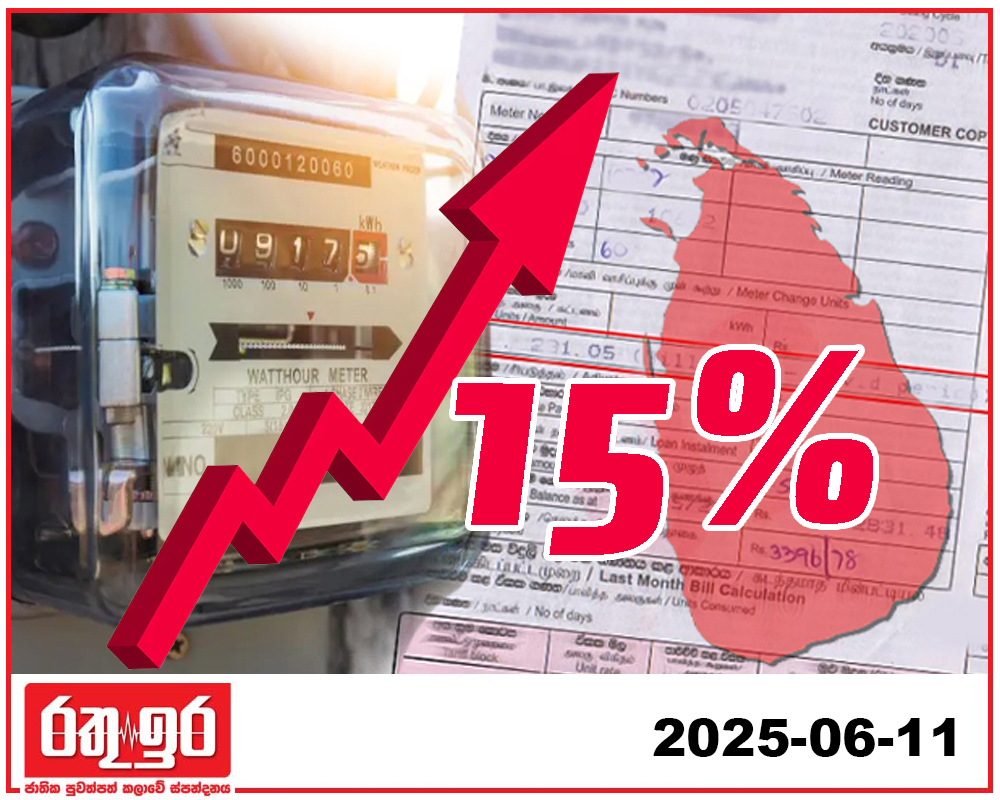 ඒ අනුව ජූලි 12වැනිදා සිට වහා ක්රියාත්මක වන පරිදි විදුලි ගාස්තු 15%කින් ඉහළ දමන බව අද පැවැති මාධ්ය හමුවේදී ඔවුන් විසින් ප්රකාශයට පත්කර ඇත.