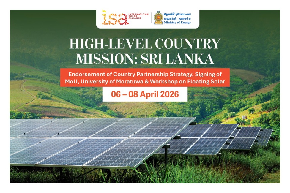 2026 අප්‍රේල් 6 සිට 9 දක්වා ශ්‍රී ලංකාවේ සූර්ය බලශක්ති සංවර්ධනයට සහාය වීම සඳහා ජාත්‍යන්තර සූර්ය සන්ධානය (International Solar AllianceISA) විශේෂ මෙහෙයුමක් ආරම්භ කර ඇත. මෙම මෙහෙයුමේ අරමුණ වන්නේ ඒකාබද්ධ හවුල්කාරිත්ව සැලැස්මක් ක්‍රියාත්මක කිරීම සහ පුනර්ජනනීය බලශක්ති අංශයේ සහයෝගීතාව ශක්තිමත් කිරීමයි.