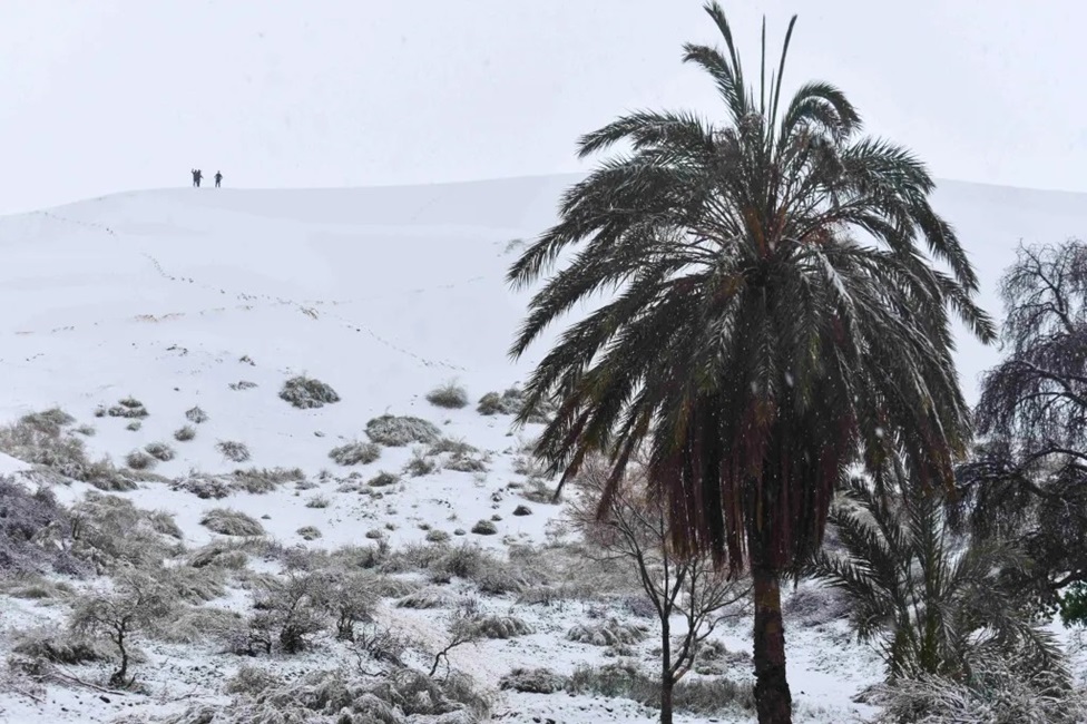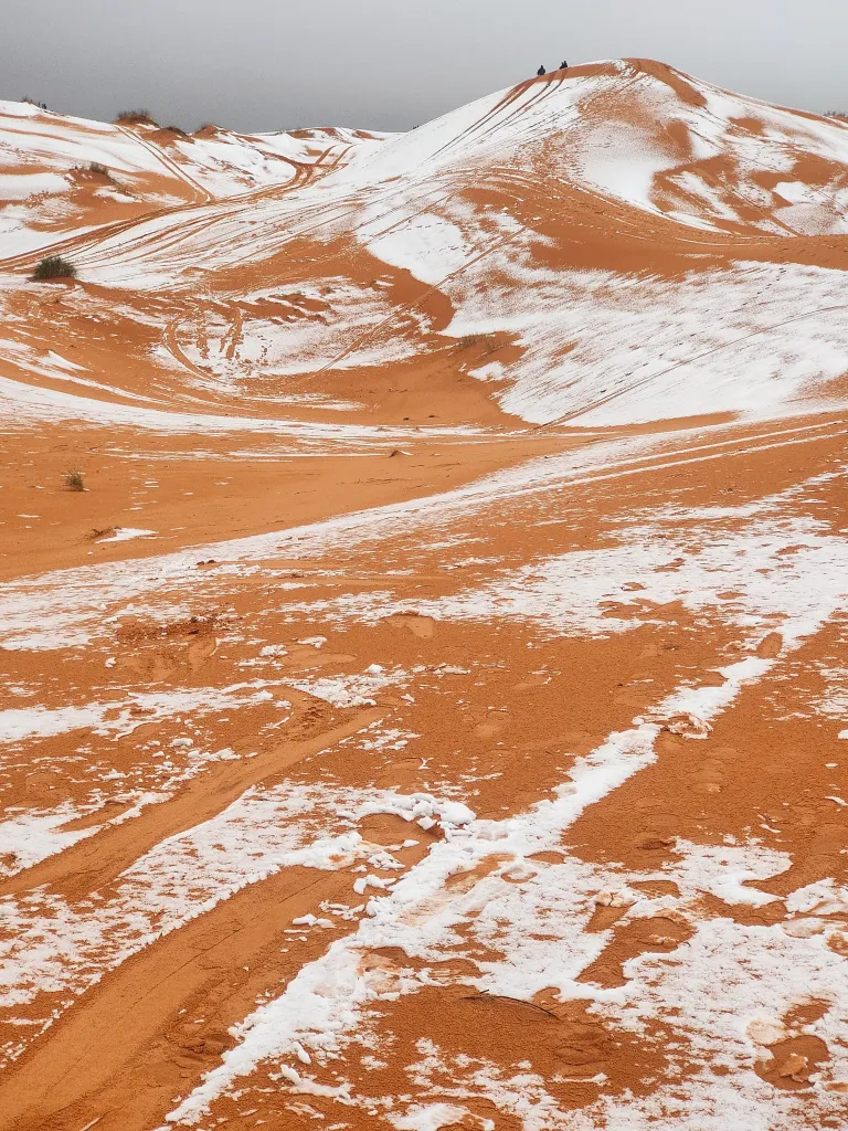 උෂ්ණත්වය හිමාංකයට වඩා පහත වැටීමෙන් පසු නිරිතදිග ඇල්ජීරියාවේ සහරා කාන්තාරයේ සමහර ප්රදේශවලට හිම පතිත වූ අතර, එම ප්රදේශයේ තැඹිලි පැහැති වැලි කඳු සුදු පැහැයෙන් වැසී ගියේය.