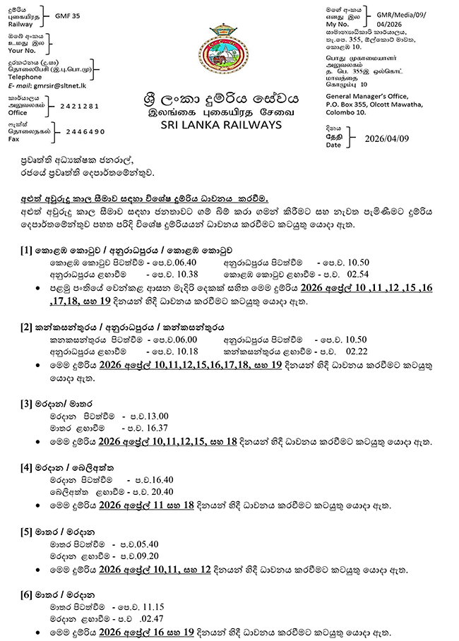දුම්රිය දෙපාර්තමේන්තුවට අනුව, 2026 අප්රේල් 10 සිට 19 දක්වා තෝරාගත් දිනවලදී අතිරේක සේවාවන් ක්රියාත්මක වන අතර එමඟින් මගීන්ට කොළඹ සහ පිට පළාත් ගමනාන්ත අතර පහසුවෙන් ගමන් කළ හැකිය.