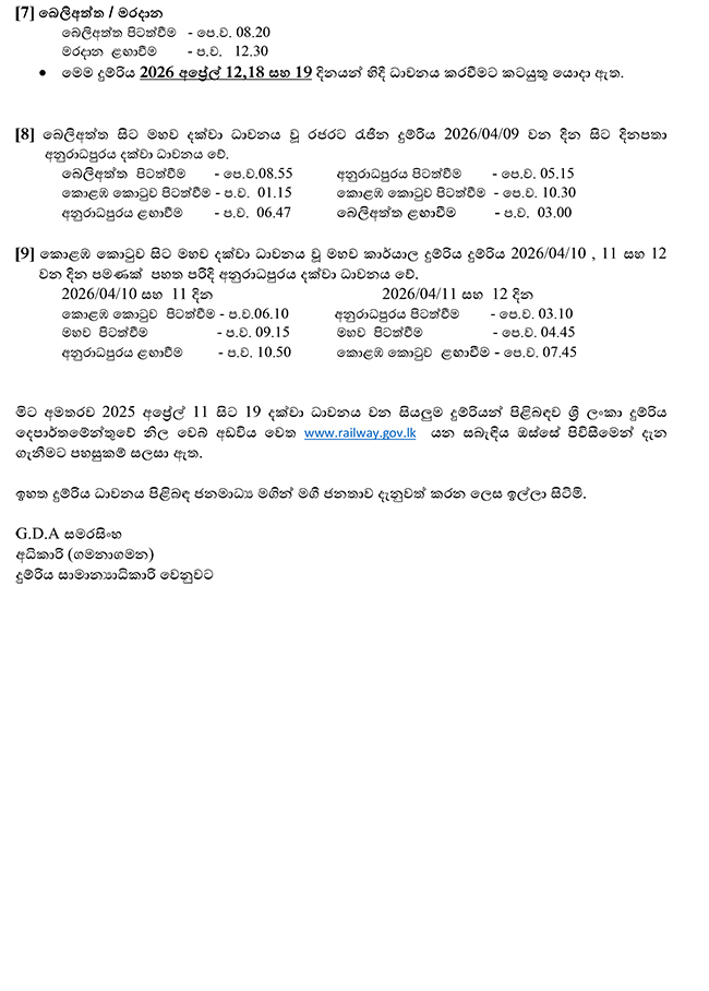 ඊට අමතරව, කොළඹ කොටුවේ සිට මහව කාර්යාල දුම්රිය අප්රේල් 10, 11 සහ 12 යන දිනවල අනුරාධපුරය දක්වා දීර්ඝ කෙරෙන අතර, ඊට අනුරූප ආපසු සේවා ද ඇත.