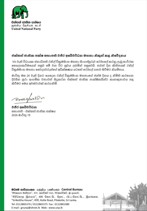 වික්රමසිංහ මහතාගේ උපන්දිනය මාර්තු 24 වන දිනට යෙදී ඇති බව සඳහන් කළ ඔහු, ආගමික වතාවත් සමඟ මෙම අවස්ථාව සනිටුහන් කරමින් රට පුරා සිටින එක්සත් ජාතික පක්ෂ ආධාරකරුවන්ට කෘතඥතාව පළ කළේය.