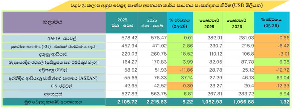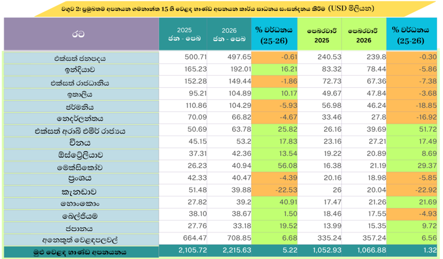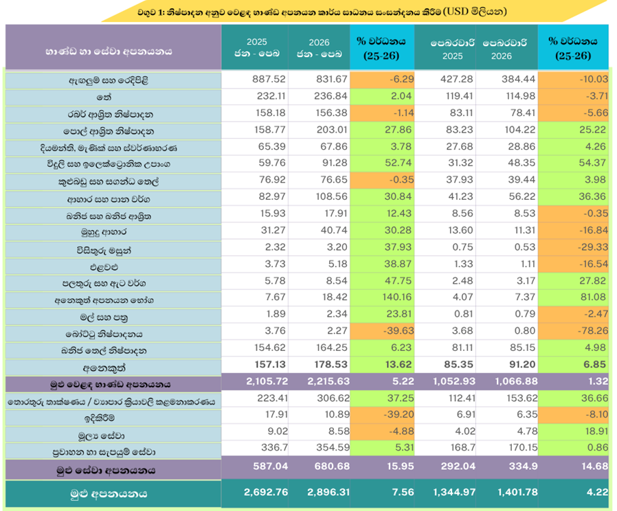 2026 ජනවාරි සිට පෙබරවාරි දක්වා කාලය තුල මුළු අපනයනය ඇමරිකානු ඩොලර් මිලියන 2,896.31 ක් ලෙස ඇස්තමේන්තු කර ඇත. එය 2025 වසරේ එම කාලයට සාපේක්ෂව 7.56% ක කැපී පෙනෙන වර්ධනයකි.
