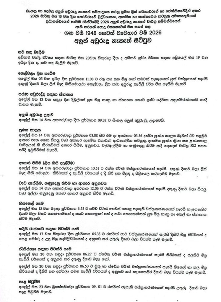 2026 වසරේ සිංහල හා දෙමළ අලුත් අවුරුද්ද සඳහා වන අවුරුදු නැකත් සීට්ටුව නිල වශයෙන් නිකුත් කර ඇති බව බුද්ධශාසන, ආගමික හා සංස්කෘතික කටයුතු අමාත්ය හිනිදුම සුනිල් සෙනෙවි මහතා පැවසීය. එම නිල නැකැත් සීට්ටුව පහත පළ වේ.