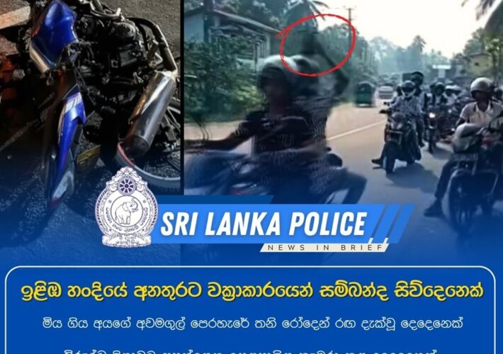 පසුගිය 16 දින රාත්රියේ රත්නපුර – පානදුර ඉළිඹ හංදිය අසලදී තරඟකාරී අයුරින් යතුරුපැදි ධාවනය කළ යතුරුපැදිකරුවන් දෙදෙනෙකු අනතුරට ලක්වූ සිද්ධියට අදාළව හොරණ පොලිස් ස්ථානයේ නිලධාරීන් පසුගිය...