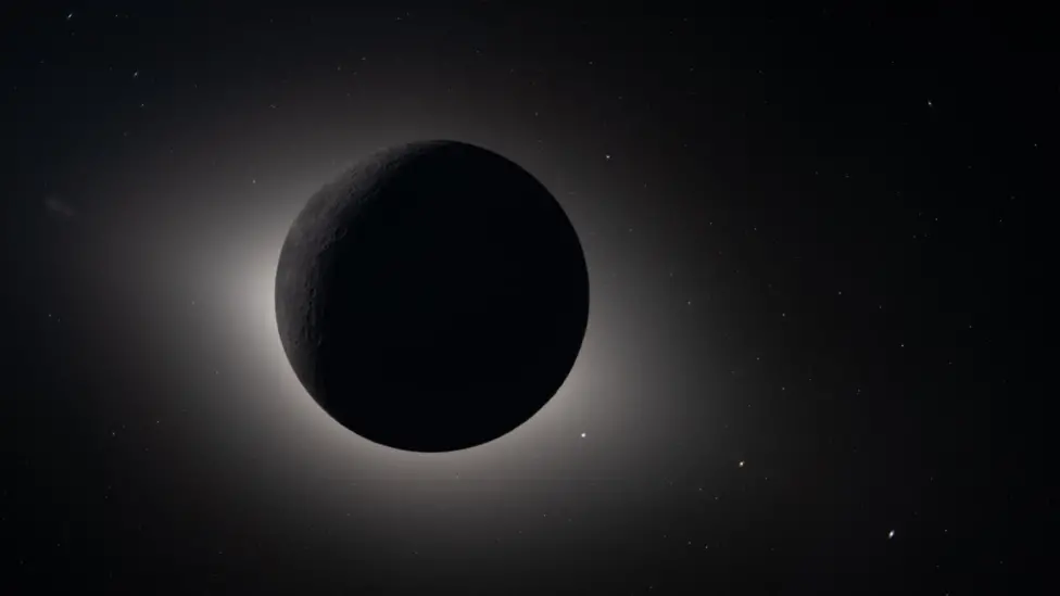 මෙම පින්තූරයේ දැක්වෙන්නේ චන්ද්රයා සූර්යයා සම්පූර්ණයෙන්ම ග්රහණය කර ගන්නා ආකාරයයි. සූර්යයාගේ පිටත වායුගෝලය සඳ පිටුපසින් එබී බලන ආකාරය දැකිය හැකිය. සඳෙන් පරාවර්තනය වන ආලෝකය ඉතා දීප්තිමත් බැවින් සාමාන්යයෙන් දෘශ්යමාන නොවන තරම් මවාපෑමක් ඇති තරු රූපයේ දක්නට ලැබේ – මන්ද චන්ද්රයා සෙවනැල්ලක පවතින බැවිනි.