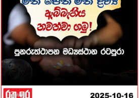 මත්ද්රව්යවලට ඇබ්බැහිවූවන්ට ස්වේච්ඡාවෙන් පුනරුත්ථාපනය වීමේ මධ්යස්ථාන 10ක් රටපුරා ස්ථාපිත කිරීමට රජය පියවර ගනී.මත් උවදුර තුරන් කිරීමේ ජාතික වැඩපිළිවෙළ යටතේ එම වැඩපිළිවෙළ ක්රියාත්මක කෙරෙන අතර, ඒ වෙනුවෙන්...