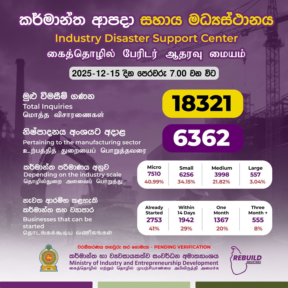කර්මාන්ත ආපදා සහාය මධ්‍යස්ථානය (IDSC) වෙත මේවන විට (15) ඇතුළත් වී දත්ත ප්‍රමණාය නැතහොත් විමසීම් ප්‍රමාණය 18321ක් වන අතර ඒ අතරින් කර්මාන්ත අමාත්‍යාංශයට අයත් නිෂ්පාදන අංශයට අදාළව ආපදාවට පත් කර්මාන්ත ගණන 6362ක්, ක්ෂ්‍රද්‍ර පරිමාණ ව්‍යපාර ගණන 7510ක්, සුළු පරිමාණ ව්‍යපාර ගණන 6256ක්, මධ්‍ය පරිමාණ ව්‍යපාර 3998ක් සහ මහා පරිමාණ ව්‍යපාර 557ක් බවට වාර්තා වී තිබෙන බව කර්මාන්ත හා ව්‍යවසාය සංවර්ධන නියෝජ්‍ය අමාත්‍ය චතුරංග අබේසිංහ මහතා පවසයි.