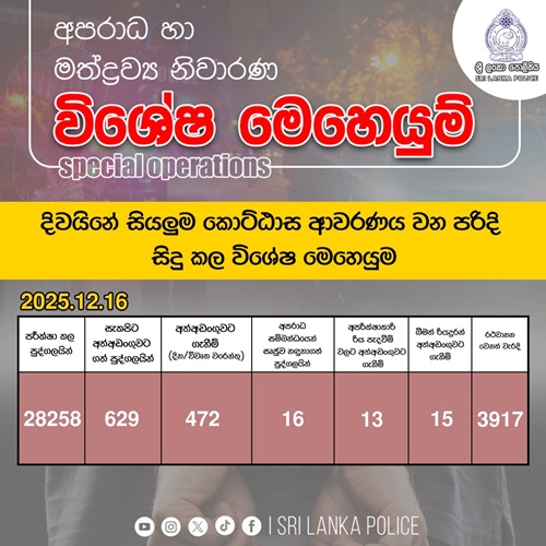 ශ්රී ලංකා පොලිසිය විසින් දිවයිනේ සියලුම පොලිස් කොට්ඨාශ ආවරණය වන පරිදි පසුගිය 16 වැනිදා ක්රියාත්මක කළ අපරාධ හා මත්ද්රව්ය නිවාරණ විශේෂ මෙහෙයුමේ දී පුද්ගලයින් 629 දෙනකු සැකපිට අත්අඩංගුවට ගෙන තිබේ.