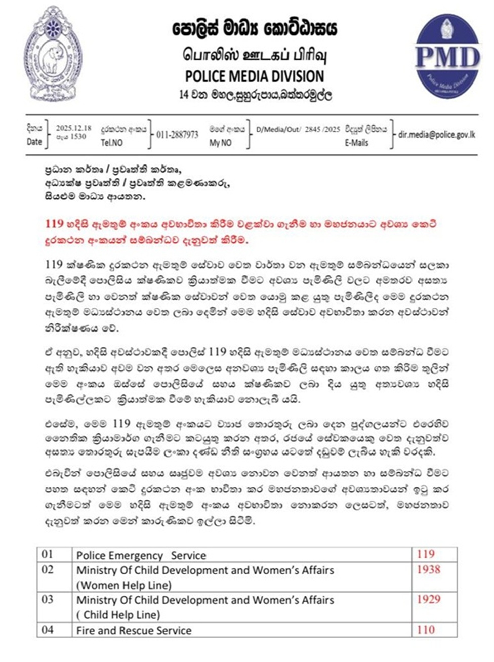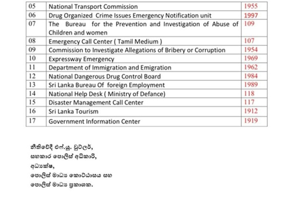 119 හදිසි ඇමතුම් අංකය අවභාවිතා කිරීම වළක්වා ගැනීම හා මහජනයාට අවශ්ය කෙටි දුරකථන අංකයන් සම්බන්ධව දැනුවත් කරමින් ශ්රී ලංකා පොලීසිය විසින් විශේෂ නිවේදනයක් නිකුත් කර තිබේ.