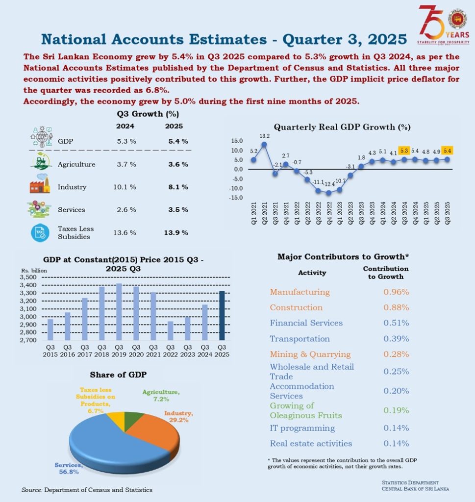 2025 තුන්වන කාර්තුවේදී ශ්රී ලංකාවේ ආර්ථික ක්රියාකාරකම් අඛණ්ඩව ශක්තිමත් වූ අතර, 2024 තුන්වන කාර්තුවේදී 5.3% ක් වූ සැබෑ දළ දේශීය නිෂ්පාදිතය 5.4% කින් වර්ධනය වූ බව ශ්රී ලංකා මහ බැංකුව පවසයි.