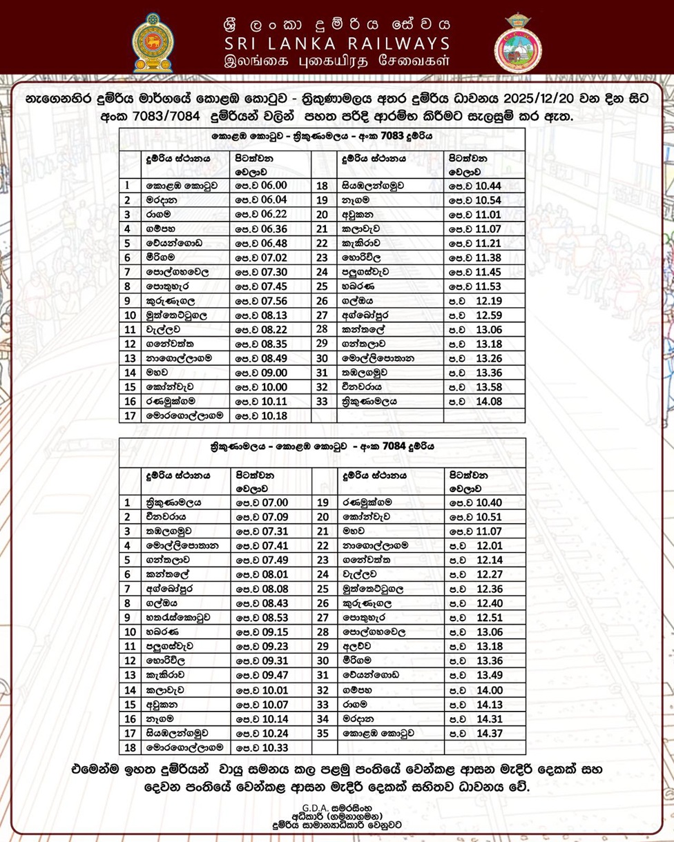 උඩරට දුම්රිය මාර්ගයේ බදුල්ල – අඹේවෙල අතර සහ නැගෙනහිර දුම්රිය මාර්ගයේ කොළඹ කොටුව – ත්රිකුණාමලය අතර දුම්රිය ධානවන හෙට (20) සිට නැවත ආරම්භ කරන බව දුම්රිය දෙපාර්තමේන්තුව අද (19) නිකුත් කළ නිල නිවේදනයක සඳහන් වේ.