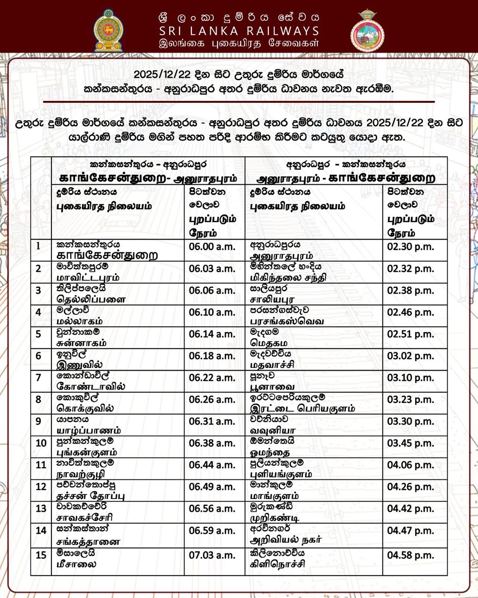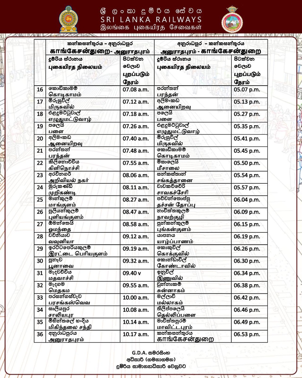 උතුරු දුම්රිය මාර්ගයේ කන්කසන්තුරය – අනුරාධපුරය අතර දුම්රිය ධානවන අද (22) දින දින යාල්රාණි දුම්රිය මගින් පහත පරිදි ආරම්භ කිරීමට කටයුතු යොදු ඇති බව දුම්රිය දෙපාර්තමේන්තුව නිකුත් කළ නිවේදනයක සදහන් වේ. එම සම්පූර්ණ කාලසටහන පහත පළ වේ.