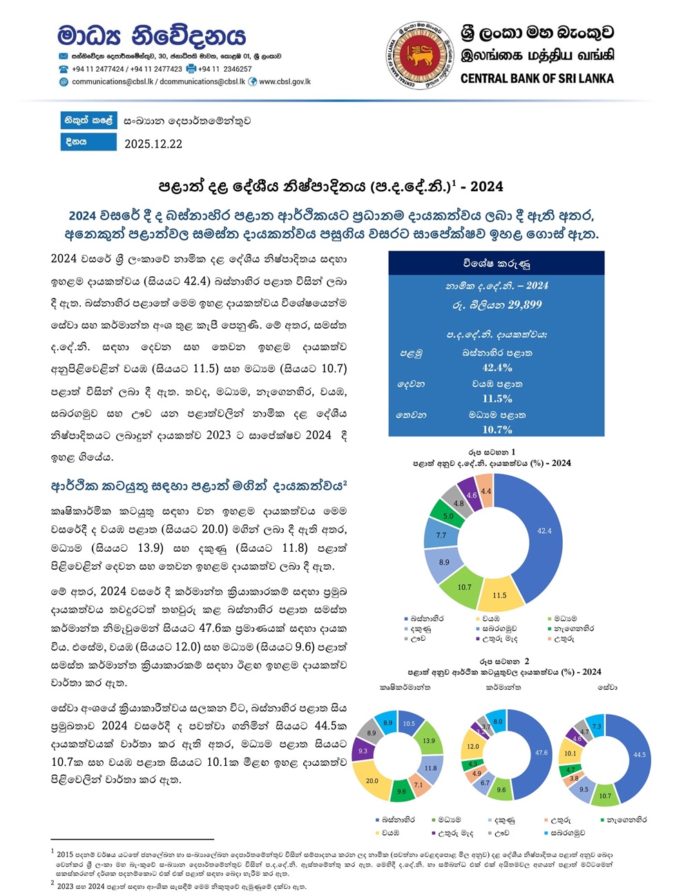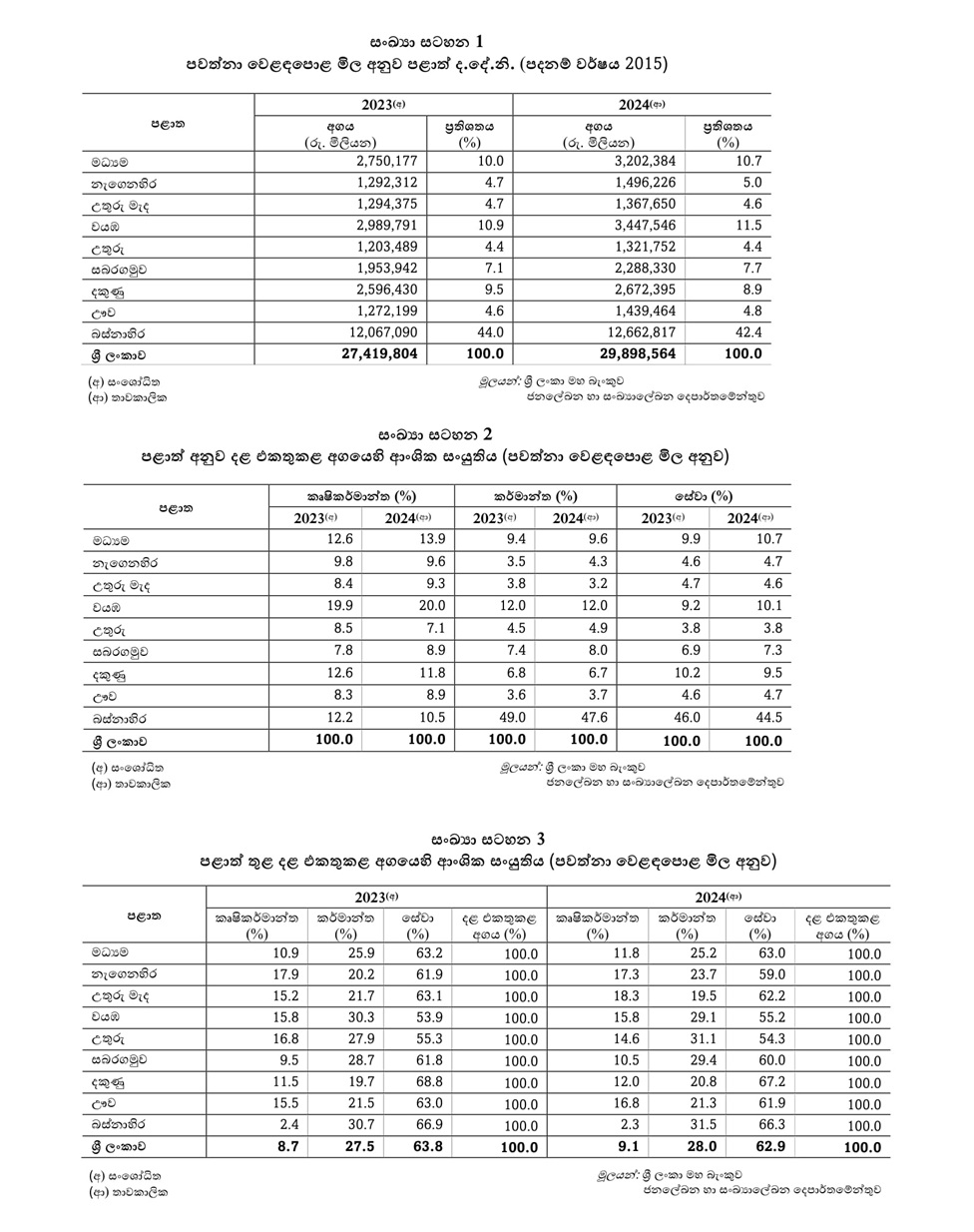 සමස්ත ද.දෙ.නි සඳහා වන ඉහළම දායකත්වය පිළිවෙළින්, වයඹ (සියයට 11.5) සහ මධ්යම (සියයට 10.7) පළාත් විසින් ලබා දී ඇත. තව ද, මධ්යම, නැගෙනහිර, වයඹ, සබරගමු සහ ඌව යන පළාත්වලින් නාමික දළ දේශීය නිෂ්පාදිතයට ලබා දුන් දායකත්වය 2023 වර්ෂයට සාපේක්ෂව 2024 දී ඉහළ ගිය බව ද ශ්රී ලංකා මහ බැංකුව නිකුත් කළ නිවේදනයේ සඳහන් වේ.
