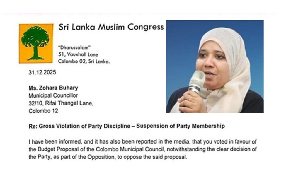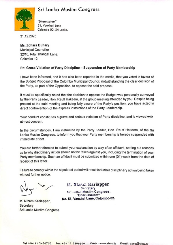 කොළඹ මහ නගර සභාවේ 2026 අයවැයට විරුද්ධව ඡන්දය ප්‍රකාශ කරන ලෙස පක්ෂ නායක රවුෆ් හකීම් මහතා පෞද්ගලිකව උපදෙස් දී තිබියදීත් කොළඹ මහ නගර සභා අයවැය යෝජනාවට පක්ෂව ඡන්දය දුන් බව කියන ශ්‍රී ලංකා මුස්ලිම් කොංග්‍රසයේ කොළඹ මහ නගර සභා මන්ත්‍රී සොහාරා බුහාරිගේ පක්ෂ සාමාජිකත්වය වහාම ක්‍රියාත්මක වන පරිදි අත්හිටුවා ඇත.
