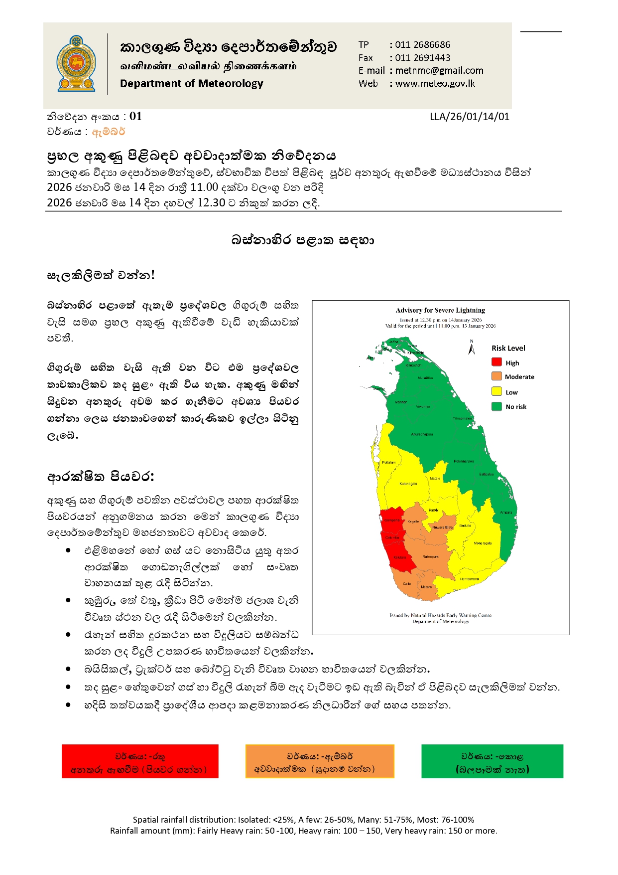 කාලගුණ විද්යා දෙපාර්තමේන්තුවේ, ස්වභාවික විපත් පිළිබඳ පූර්ව අනතුරු ඇඟවීමේ මධ්යස්ථානය විසින් අද (14) දින රාත්රී 11.00 දක්වා වලංගු වන පරිදි අදදහවල් 12.30 ට නිකුත් කරන ලද ප්රබල අකුණු පිළිබඳව අවවාදාත්මක නිවේදනයක් නිකුත් කර ඇත. එම නිල නිවේදනය පහත පළ වේ.