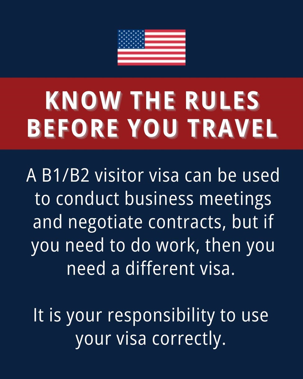 එම නිවේදනය සම්පූර්ණයෙන් මෙසේ ය “ ඔබ සංචාරය කිරීමට පෙර අදාළ නීති පිළිබඳ දැනුවත් වන්න. ව්යාපාරික රැස්වීම් පැවැත්වීමට සහ කොන්ත්රාත්තු සාකච්ඡා කිරීමට B1/B2 ආගන්තුක වීසා බලපත්රයක් භාවිතා කළ හැකිය, නමුත් ඔබට රැකියාවක් කිරීමට අවශ්ය නම්, ඔබට වෙනස් වීසා බලපත්රයක් අවශ්ය වේ. අනවසරයෙන් රැකියා කිරීම අනාගතයේදී ඔබව පිටුවහල් කිරීමට සහ/හෝ ඔබ එක්සත් ජනපදයට ඇතුළුවීම ස්ථිරව තහනම් කිරීමටද හේතු විය හැක”.