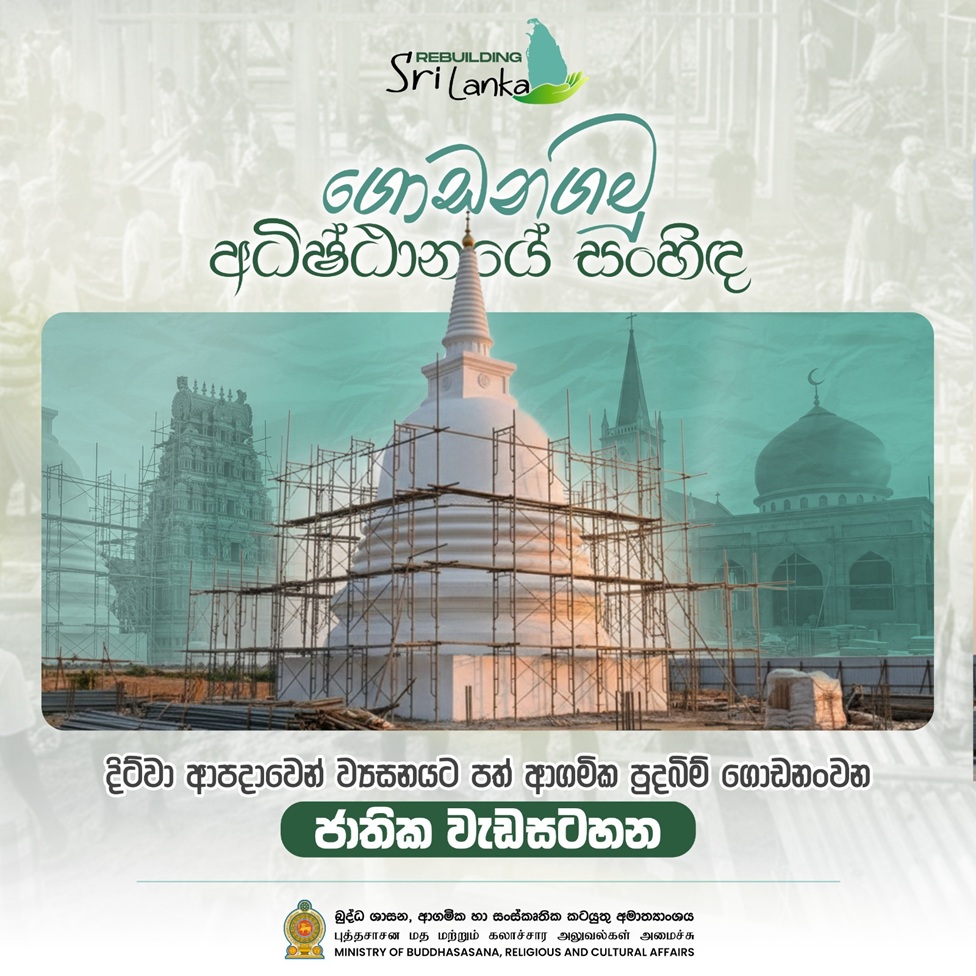දිට්වා සුළි කුණාටුවෙන් හානියට පත් ආගමික සිද්ධස්ථාන කඩිනමින් ප්රතිසංස්කරණය කර බැතිමතුන්ගේ වන්දමාන සහ ආගමික කටයුතු සඳහා ලබා දීම වෙනුවෙන්, රජය ක්රියාත්මක කරන ‘ගොඩනඟමු අධිෂ්ඨානයේ සංහිඳ’ ජාතික වැඩසටහන, බුද්ධශාසන, ආගමික සහ සංස්කෘතික කටයුතු අමාත්යාංශයේ මෙහෙය වීමෙන්, ජනාධිපති අනුර කුමාර දිසානායක මහතාගේ ප්රධානත්වයෙන් හෙට (27) දින පෙරවරු 10.00ට ගම්පොළ දොරගල පීකොක් හිල් ජනපදයේ ශ්රී බෝධිරුක්ඛාරාම විහාරස්ථානයෙන් සහ එදිනම පස්වරු 3.00ට මාතලේ කවටයාමුණ පුරාණ රජමහා විහාරයෙන් ආරම්භ වීමට නියමිතය.