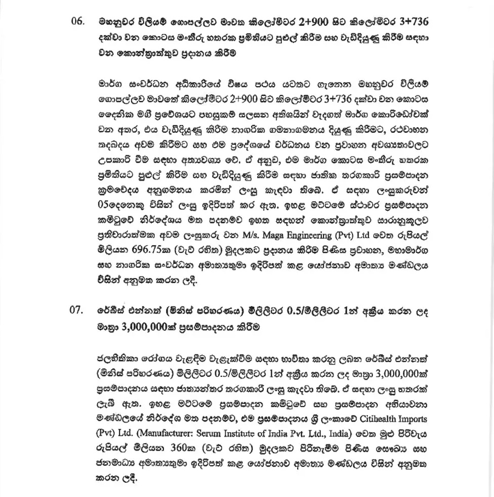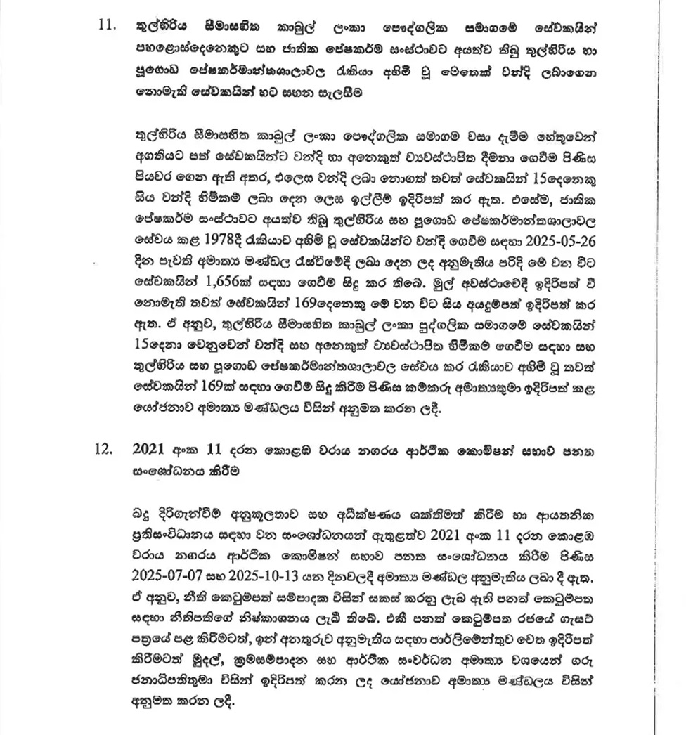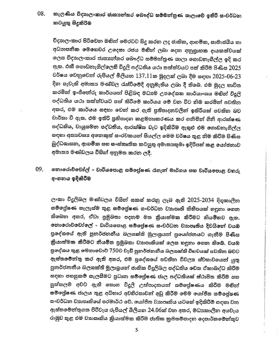 ජනාධිපති අනුර කුමාර දිසානායක මහතාගේ ප්රධානත්වයෙන් පසුගිය 24 වැනිදා රැස් වූ කැබිනට් මණ්ඩලය විසින් ගන්නා ලද කැබිනට් තිරණ රජයේ ප්රවෘත්ති දෙපාර්තමේන්තුව විසින් මාධ්ය වෙත නිකුත් කර තිබේ. එම සම්පූර්ණ වාර්තාව පහත පළ වේ.