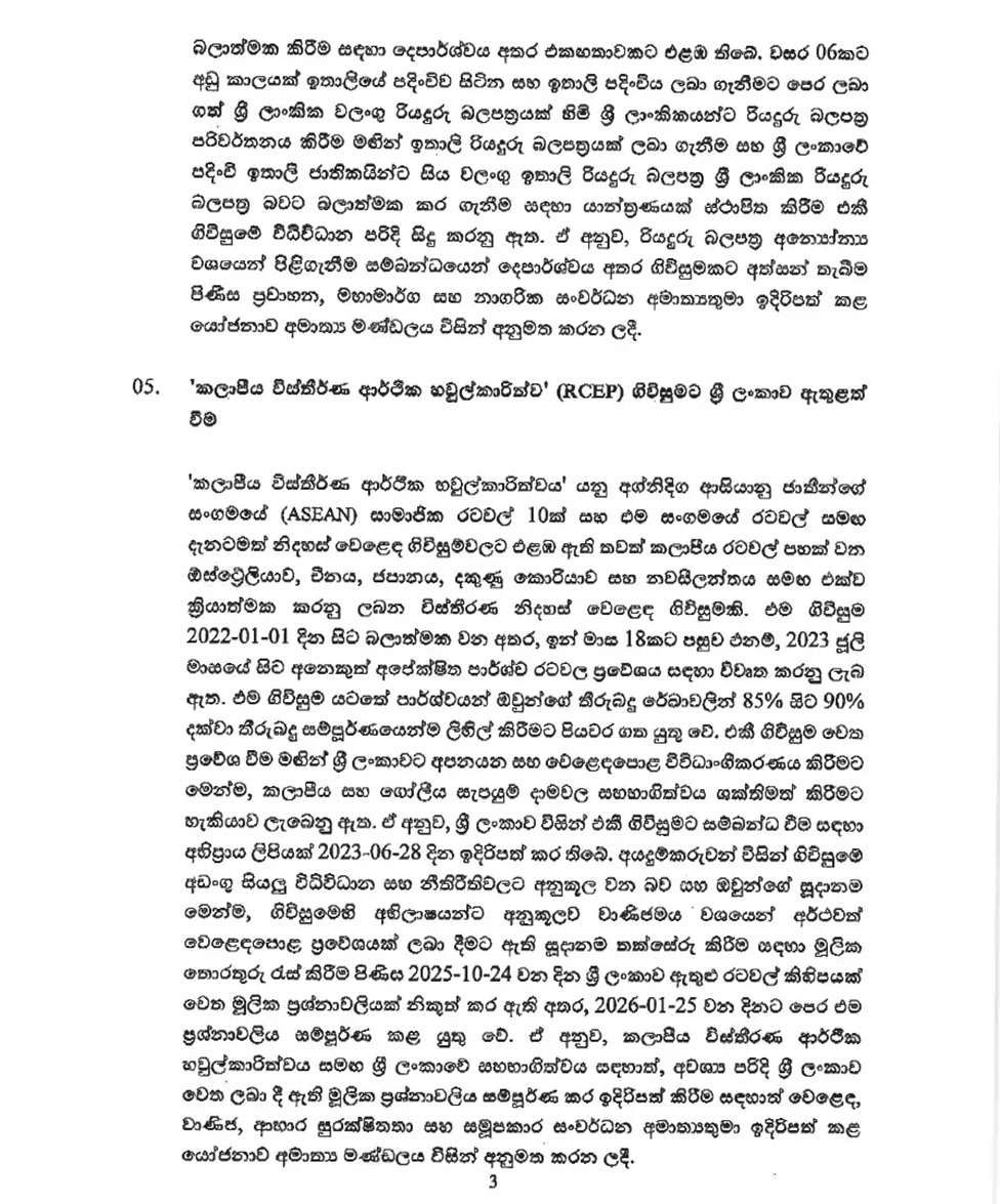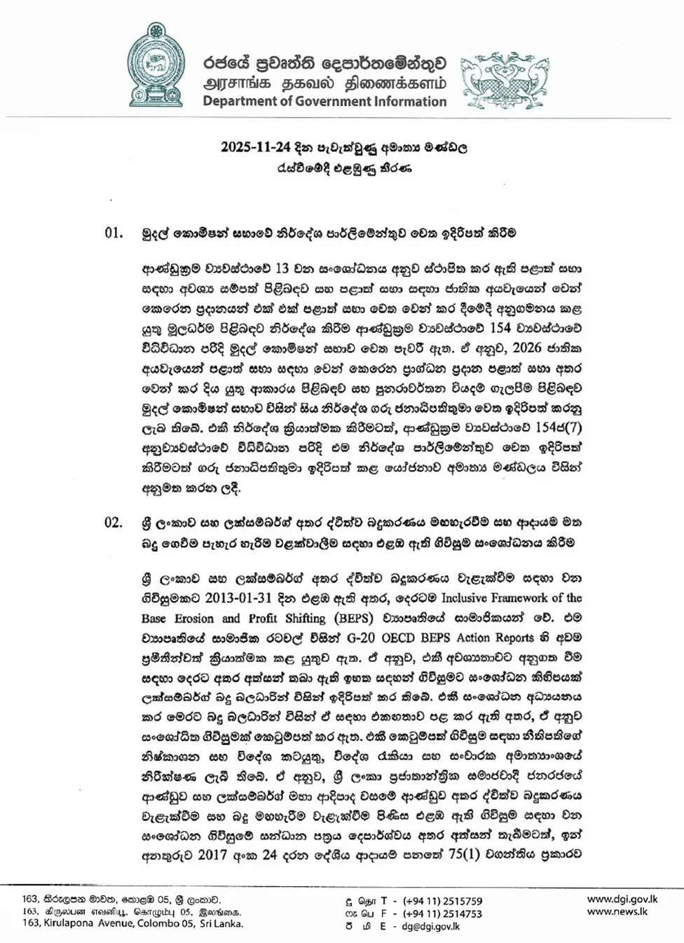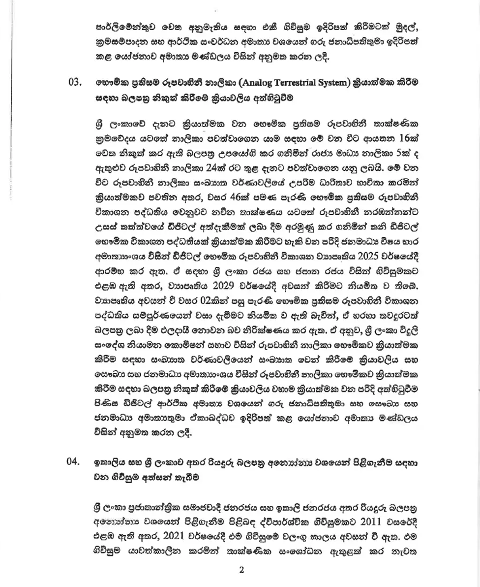 ජනාධිපති අනුර කුමාර දිසානායක මහතාගේ ප්රධානත්වයෙන් පසුගිය 24 වැනිදා රැස් වූ කැබිනට් මණ්ඩලය විසින් ගන්නා ලද කැබිනට් තිරණ රජයේ ප්රවෘත්ති දෙපාර්තමේන්තුව විසින් මාධ්ය වෙත නිකුත් කර තිබේ. එම සම්පූර්ණ වාර්තාව පහත පළ වේ.