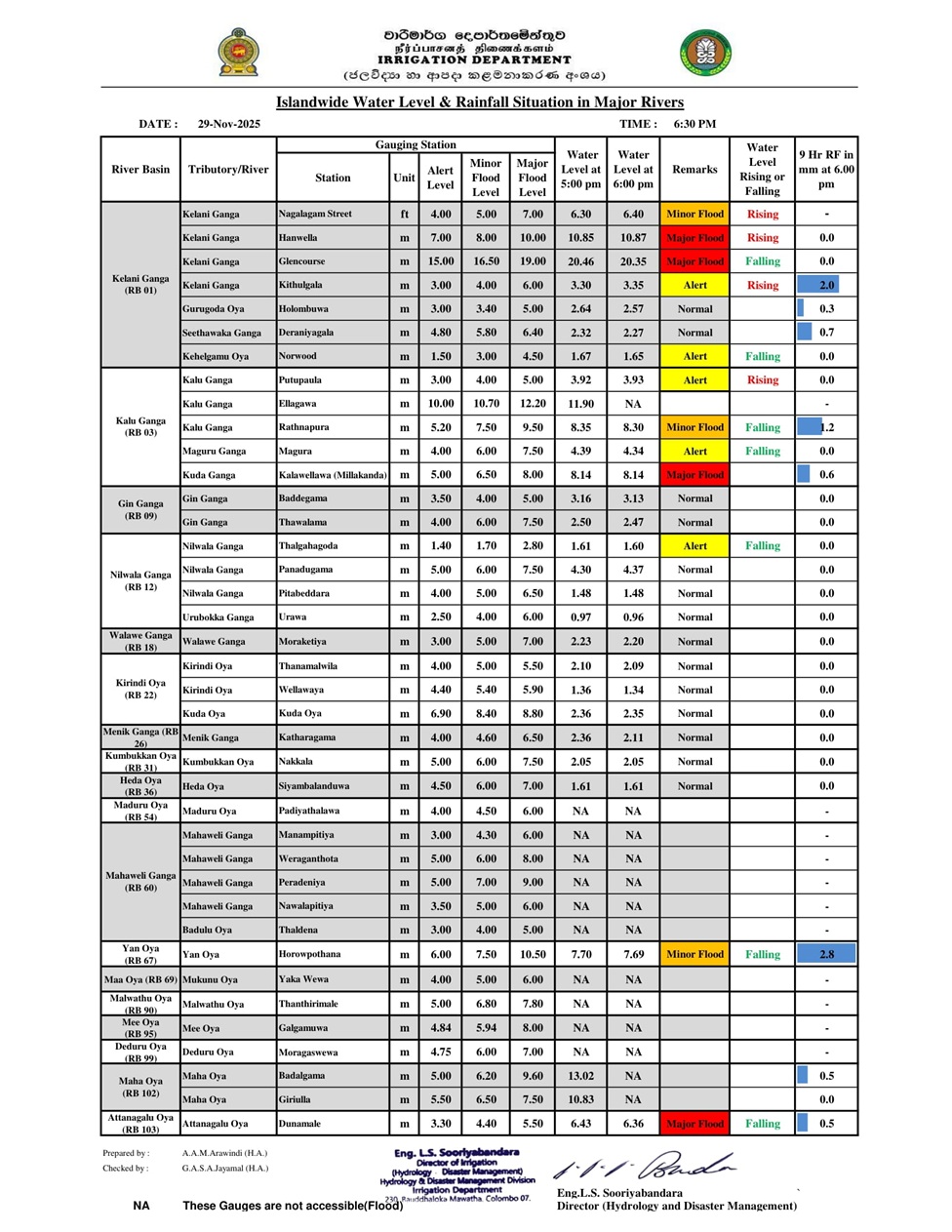වාරිමාර්ග දෙපාර්තුමෙන්තු විසින් අද (29) පස්වරු 6.30ට ප්‍රධාන ගංගාවල ජල මට්ටම් පිළබද නිල නිවේදනය නිකුත් කළේය. කැළණි ග, කලු ග සහ අත්තනගළු ඔය සහා රතු නිවේදනතව දුරටත් නිකුත් කර ඇත.