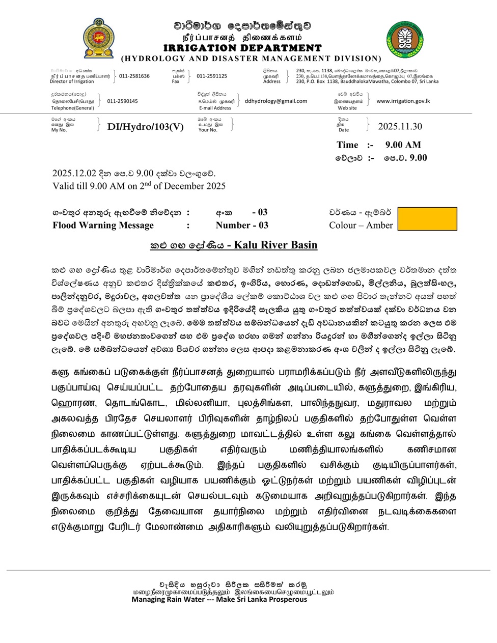 වාරිමාර්ග දෙපාර්තමේන්තුව විසින් අද (30) දින පෙරවරු 09.00ට නිකුත් කළ තත්ත්වය වාර්තාව මගින් කළු ගංඟ නිම්නයේ කලුතර, ඉංගිරිය, හොරණ, දොඩංගොඩ, මිල්ලනිය, බුලත්සිංහල, පාලින්දනුවර, මදුරාවල සහ අගලවත්ත යන ප්රාදේශීය ලේකම් කොට්ඨාශ වල පහත් බිම්වල පිටාර තැන්නට බලපා ඇති ගංවතුර ඉදිරියේ දී සැලකිය යුතු ගංවතුර තත්ත්වයක් දක්වා වර්ධනය විය හැකි බවට අනතුරු අඟවා ඇත.