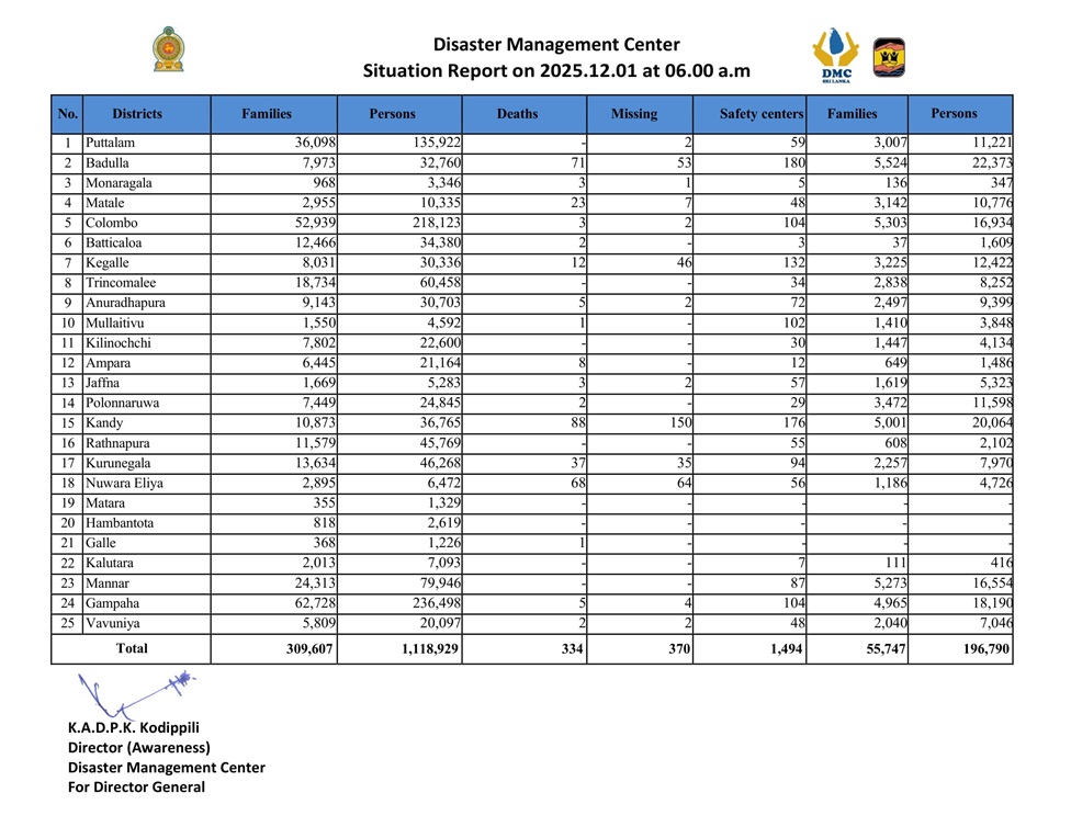 ආපදා කළමනාකරණ මධ්යස්ථානය විසින් අද (01) දින පෙරවරු 06.00ට තත්ත්ව වාර්තාව නිකුත් කර ඇත. එම වාර්තාව අනුව දෙසැම්බර් 01 වැනි දිනට ආපදා තත්ත්වය හේතුවෙන් පුද්ගල මරණ 334ක් වාර්තා වී ඇති අතර පුද්ගලයින් 370ක් අතුරුදන් වී ඇත. වැඩිම පුද්ගලයින් පිරිසක් මරණයට පත්ව ඇත්තේ මහනුවර දිස්ත්රික්කයෙනි. ඒ පුද්ගල මරණ 88කි. බදුල්ල දිස්ත්රික්කයෙන් පුද්ගල මරණ 71ක් ද නුවරළිය දිස්ත්රික්කයෙන් පුද්ගල මරණ 68ක් ද වාර්තා වී ඇත.