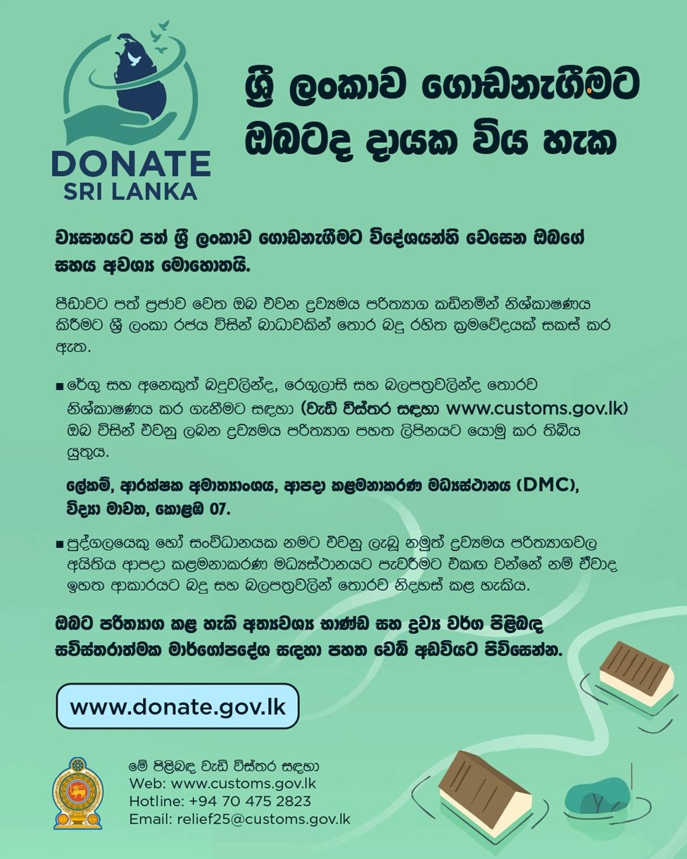 www.customs.gov.lk වෙබ් අඩවියට පිවිසීමෙන් හෝ +94 70 475 2823 Hotline අංකය ඔස්සේ හෝ relief25@customs.gov.lk ඊමේල් අංකය මගින් මේ පිළිබඳ වැඩි විස්තර ලබාගත හැකිය.