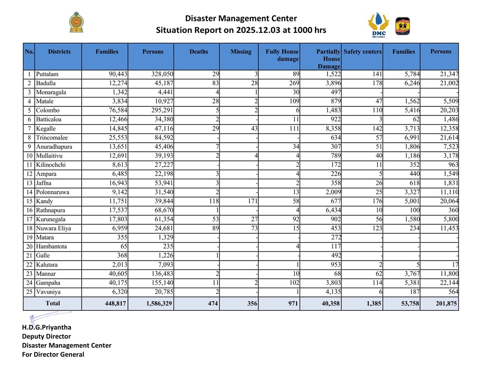 ආපදා තත්ත්වය හේතුවෙන් සිදු වූ මරණ සංඛ්යාව 474 දක්වා ඉහළ ගොස් ඇතැයි ආපදා කළමනාකරණ මධ්යස්ථානය අද (03) පෙරවරු 10.00ට නිකුත් කළ තත්ත්ව වාර්තාවේ සදහන් වෙයි. අතුරුදන් වූ පුද්ගලයින් සංඛ්යාව මේ වන විට 356ක් වන අතර ආරක්ෂිත මධ්යස්ථාන 1385ක පවුල් 53,758කට අයත් පුද්ගලයින් 201,875ක් රැදී සිටින බව ද එම වාර්තාව වැඩි දුරටත් ප්රකාශ කරයි. අද දින වන විට දිට්වා සුළි කුණාටුවෙන් විපතට පත් පුද්ගලයින් සංඛ්යාව 15,86, 329ක් බව ද එම වාර්තාව පවසයි.