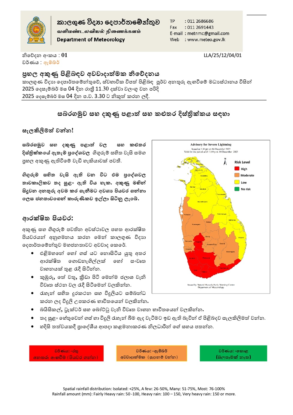 කාලගුණ විද්යා දෙපාර්තමේන්තුවේ, ස්වභාවික විපත් පිළිබඳ පූර්ව අනතුරු ඇඟවීමේ මධ්යස්ථානය විසින් 2025 දෙසැම්බර් මස 04 දින රාත්රී 11.30 දක්වා වලංගු වන පරිදි 2025 දෙසැම්බර් මස 04 දින ප.ව. 3.30 ට නිකුත් කරන ලදී.