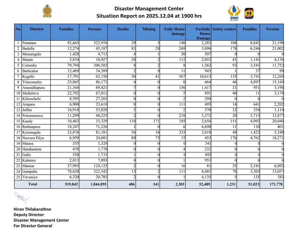 ආපදා කළමනාකරණ මධ්යස්ථානය විසින් අද (04) දින පස්වරු 09.00ට නිකුත් කළ තත්ත්ව වාර්තාව අනුව පසුගිය ආපදා තත්ත්වය හේතුවෙන් අද දින පස්වරු 09.00 වන විට මිය ගිය සංඛ්යාව 486ක් බවත් පුද්ගලයින් 341 දෙනකු අතුරුදන්වී ඇති බවත් සදහන් කරයි.