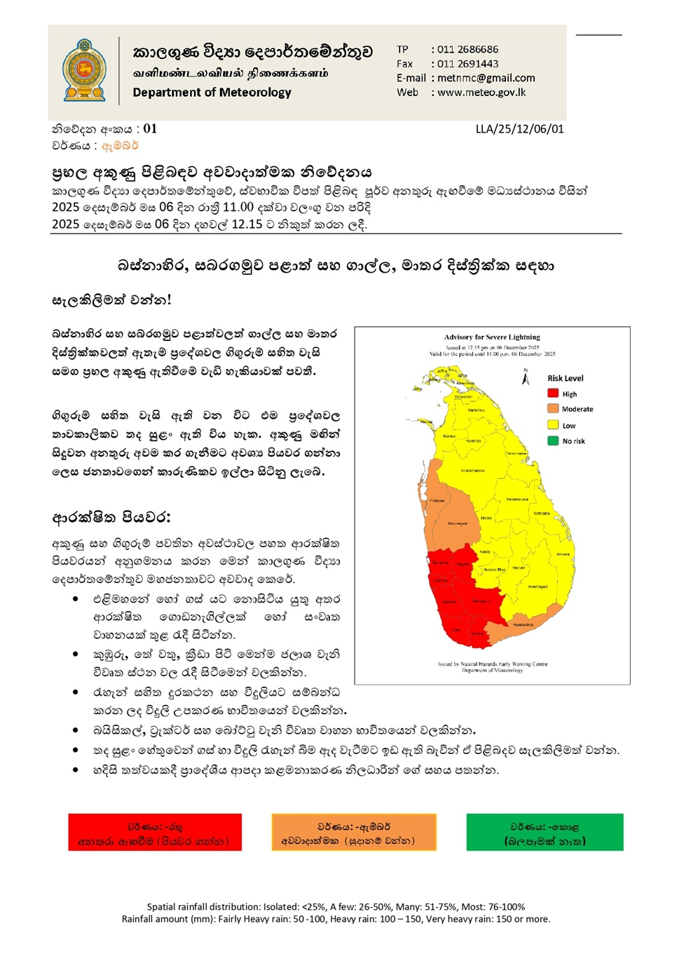 ගිගුරුම් සහිත වැසි සමග ඇතිවිය හැකි තාවකාලික තද සුළං වලින් සහ අකුණු මඟින් සිදු වන අනතුරු අවම කර ගැනීමට අවශ්‍ය පියවර ගන්නා ලෙස ජනතාවගෙන් කාරුණිකව ඉල්ලා සිටිනු ලැබේ.
